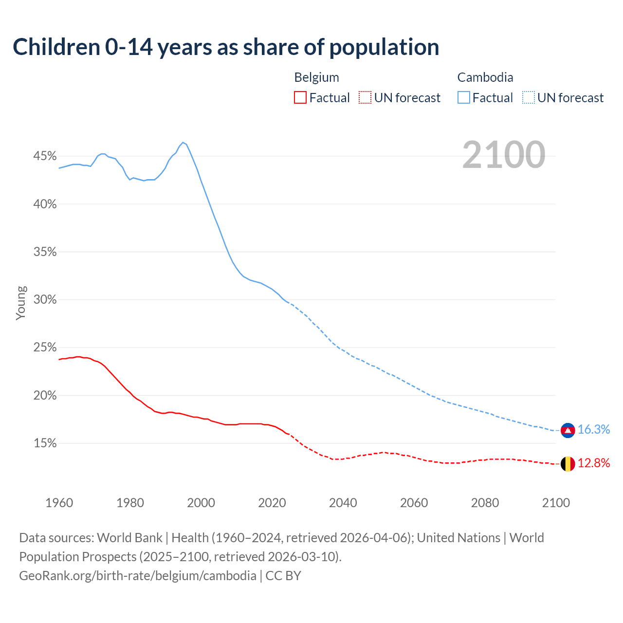 According to the latest available data on birth rates, the fertility rate in Belgium was 1.47 children per woman in 2023, compared to 2.58 in Cambodia in 2023. The replacement level is considered to be 2.1 children per woman.