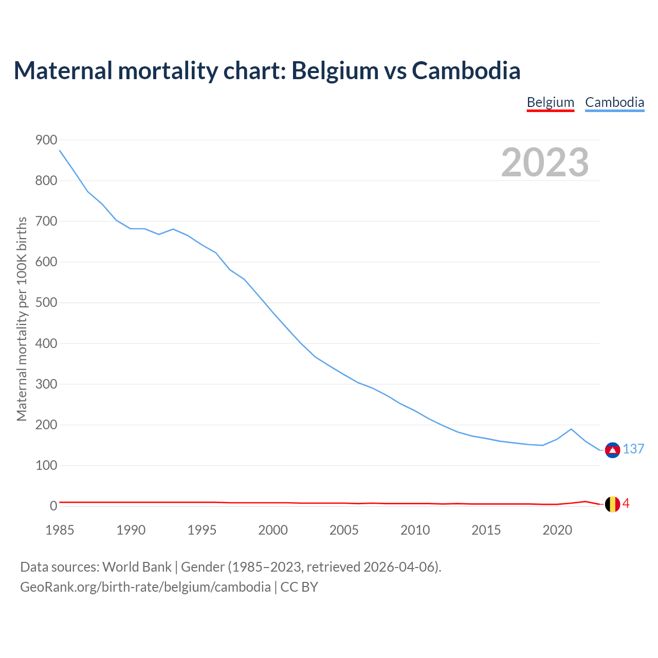 The maternal mortality rate, which is the probability of dying during childbirth or within 42 days of pregnancy termination, is 4 deaths per 100,000 live births in Belgium, compared to 137 deaths in Cambodia.