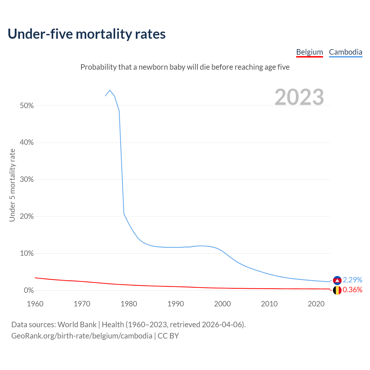 The chance that a newborn baby will die before reaching age five is 0.36% in Belgium and 2.29% in Cambodia. Above is a chart with historical data on under-five mortality rates.
