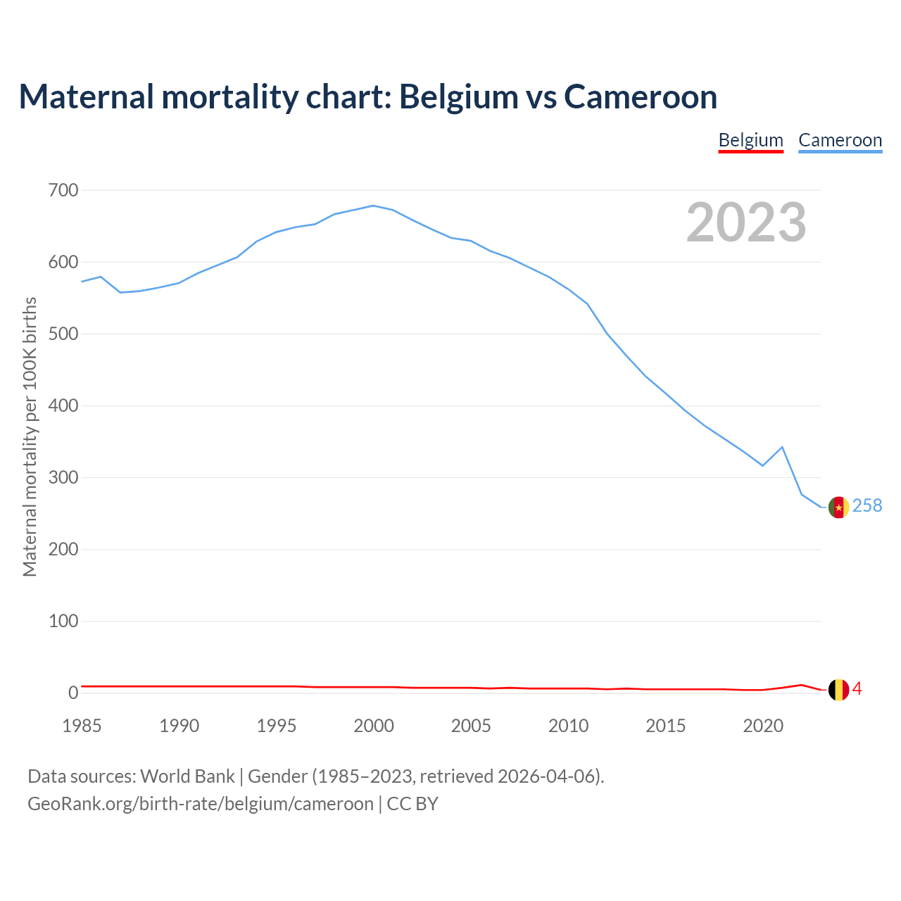 The maternal mortality rate, which is the probability of dying during childbirth or within 42 days of pregnancy termination, is 4 deaths per 100,000 live births in Belgium, compared to 258 deaths in Cameroon.