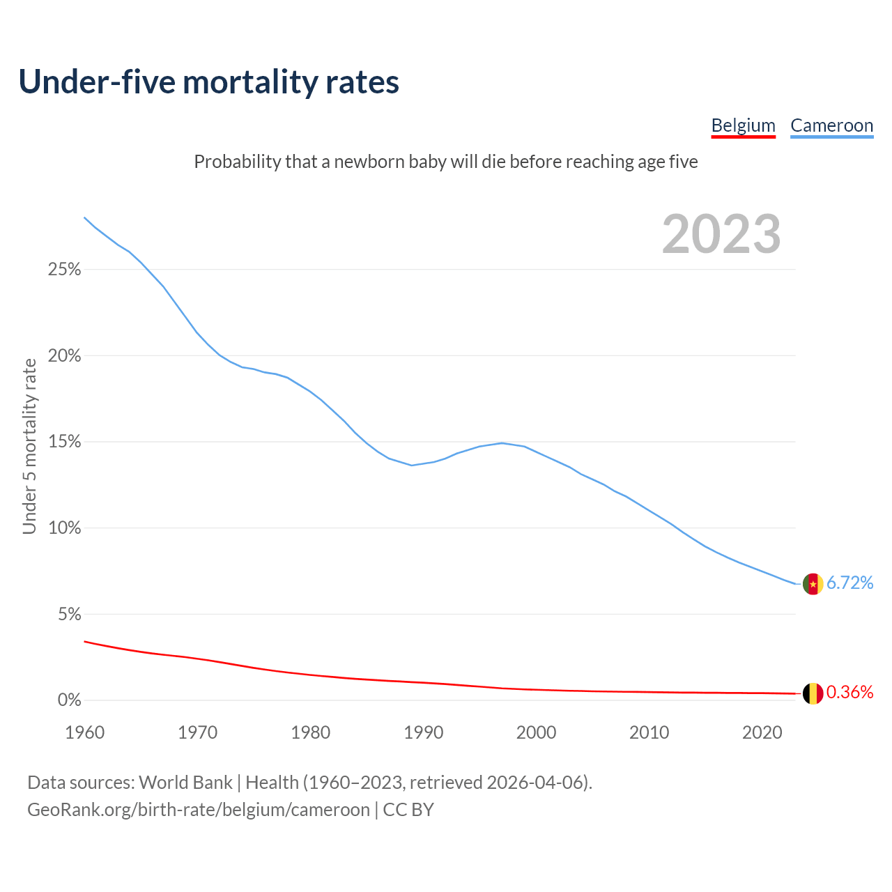 The chance that a newborn baby will die before reaching age five is 0.36% in Belgium and 6.72% in Cameroon. Above is a chart with historical data on under-five mortality rates.