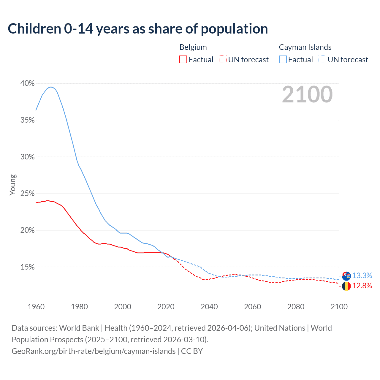 Children aged 0-14 make up 16% of the population in Belgium and 16.2% in the Cayman Islands in 2024, compared to 18.1% and 22.3% respectively in 1990.