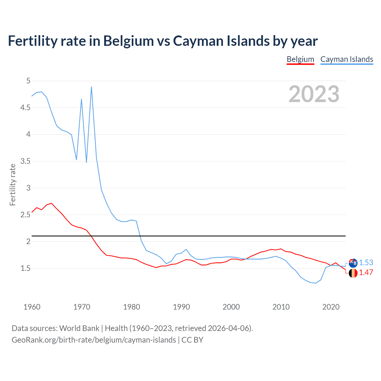 Fertility rate in Belgium vs Cayman Islands by year