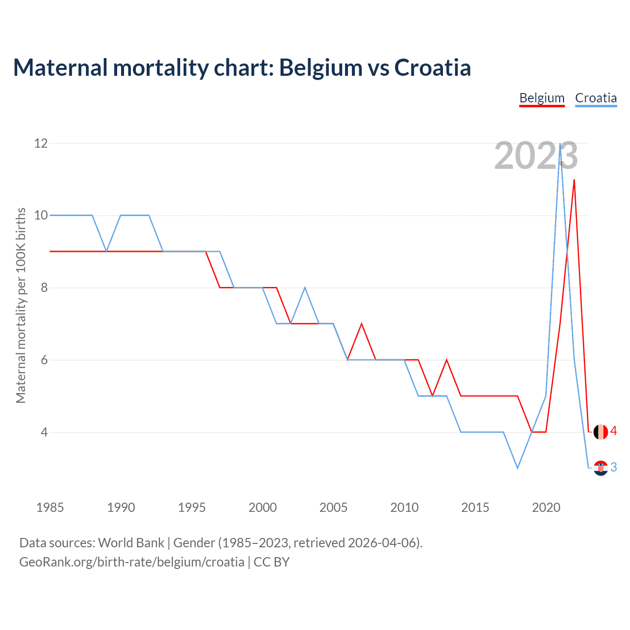 The maternal mortality rate, which is the probability of dying during childbirth or within 42 days of pregnancy termination, is 4 deaths per 100,000 live births in Belgium, compared to 3 deaths in Croatia.