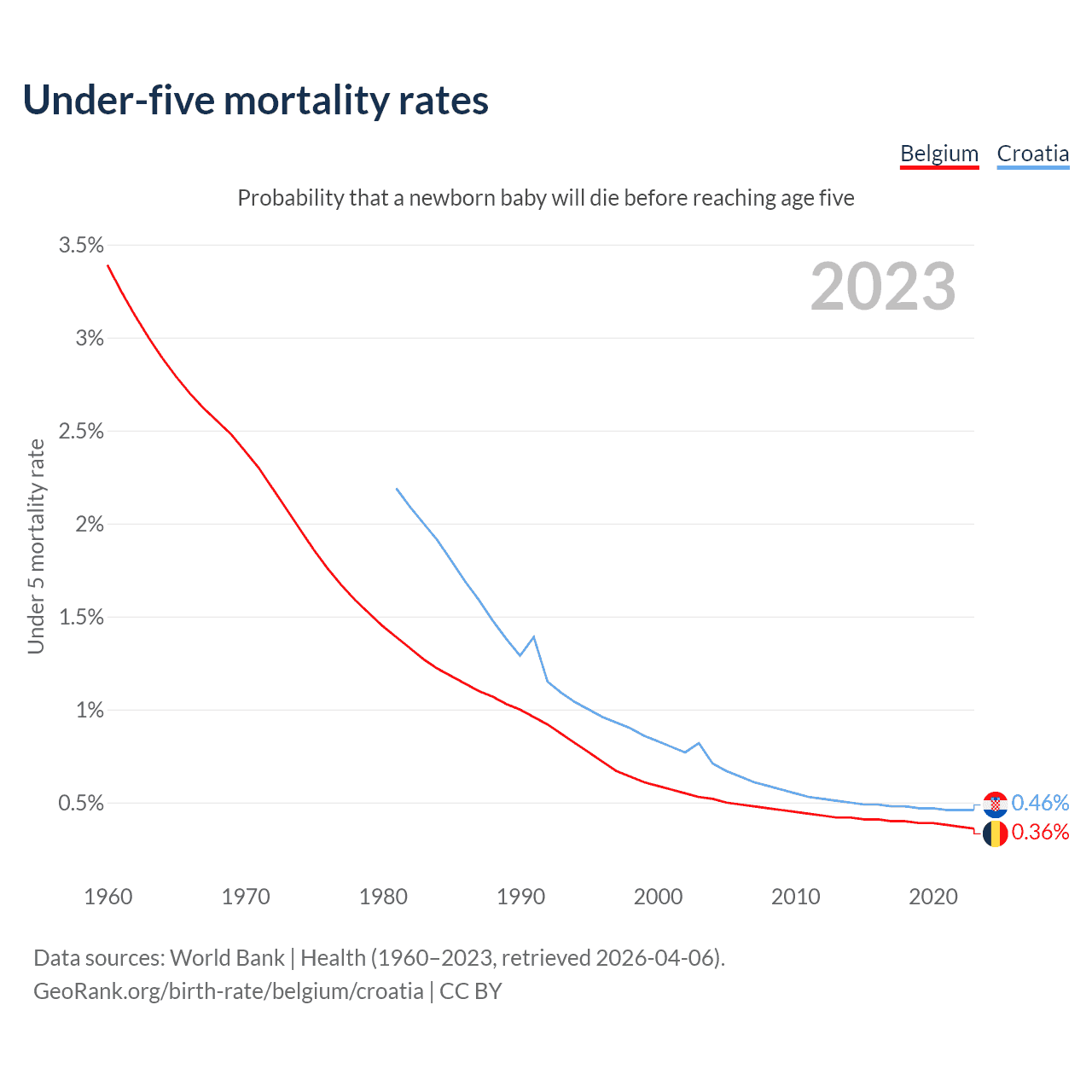 The chance that a newborn baby will die before reaching age five is 0.36% in Belgium and 0.46% in Croatia. Above is a chart with historical data on under-five mortality rates.