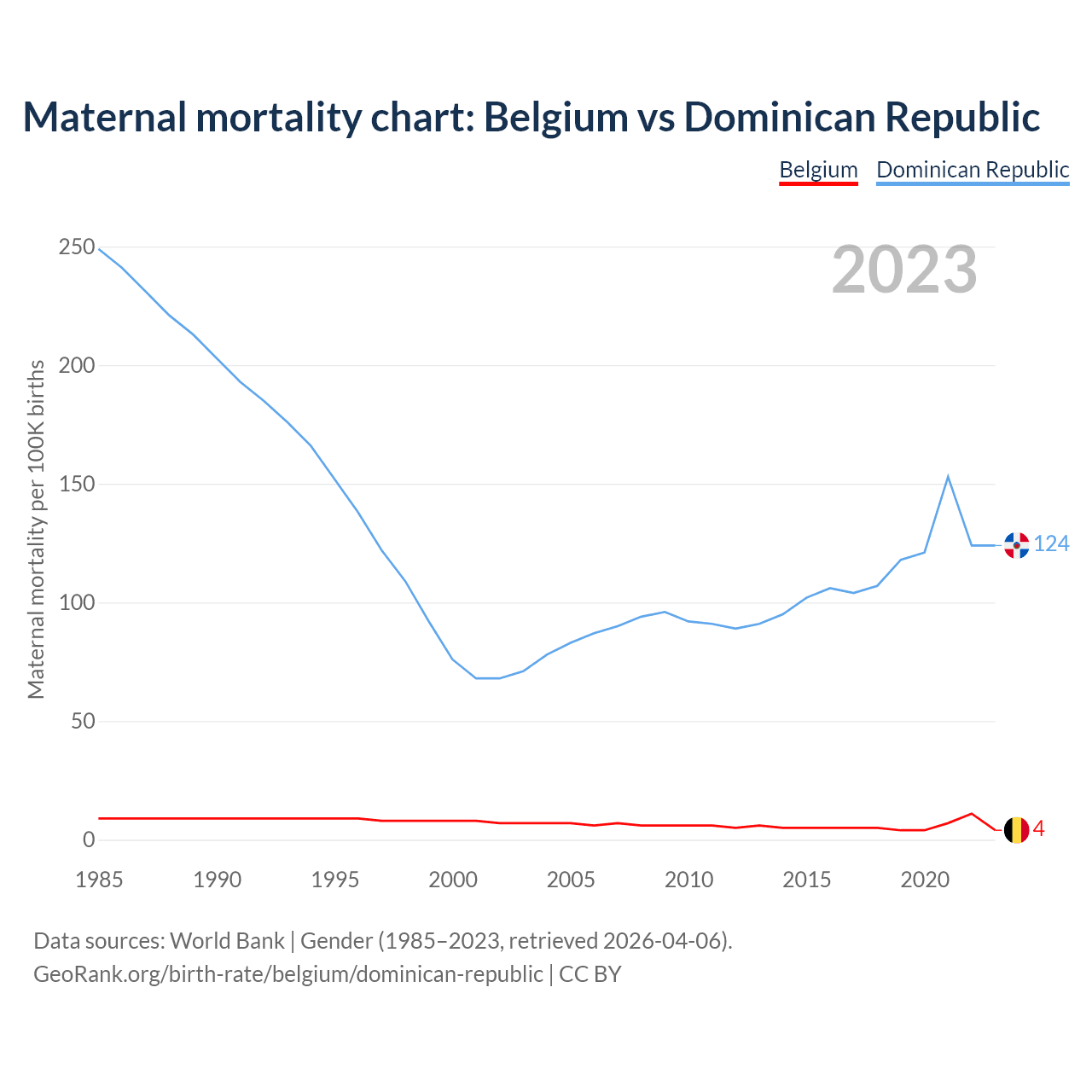 The maternal mortality rate, which is the probability of dying during childbirth or within 42 days of pregnancy termination, is 4 deaths per 100,000 live births in Belgium, compared to 124 deaths in the Dominican Republic.