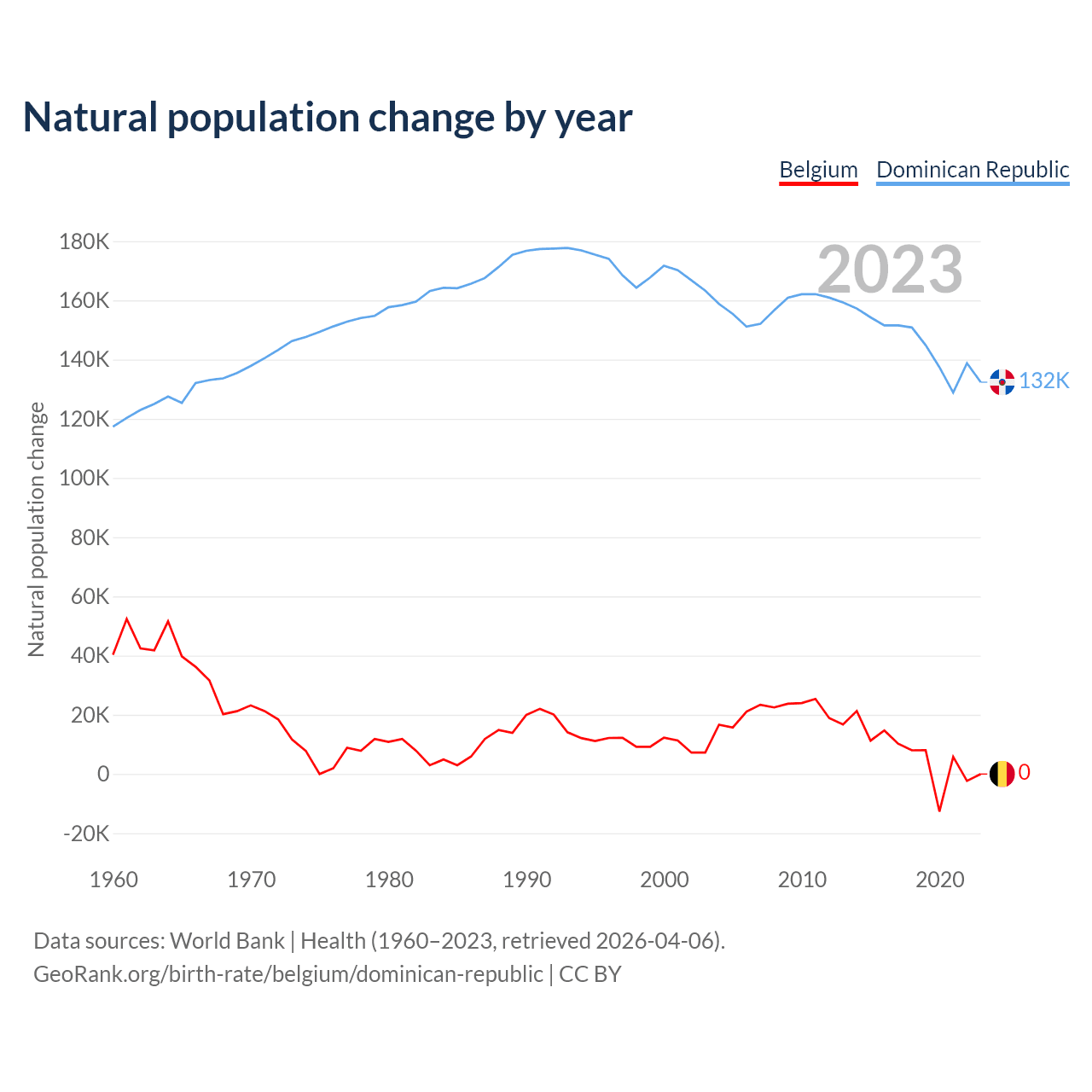Belgium has an annual birth rate of 9.4 births per 1,000 people, compared to 17.9 for the Dominican Republic. The average number of children a woman is expected to have during her lifetime — the fertility rate, is 1.47 in Belgium and 2.24 in the Dominican Republic — 52.6% difference.