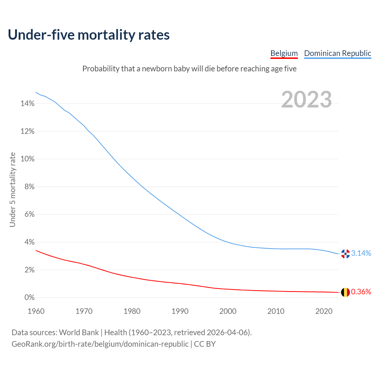 The chance that a newborn baby will die before reaching age five is 0.36% in Belgium and 3.14% in the Dominican Republic. Above is a chart with historical data on under-five mortality rates.