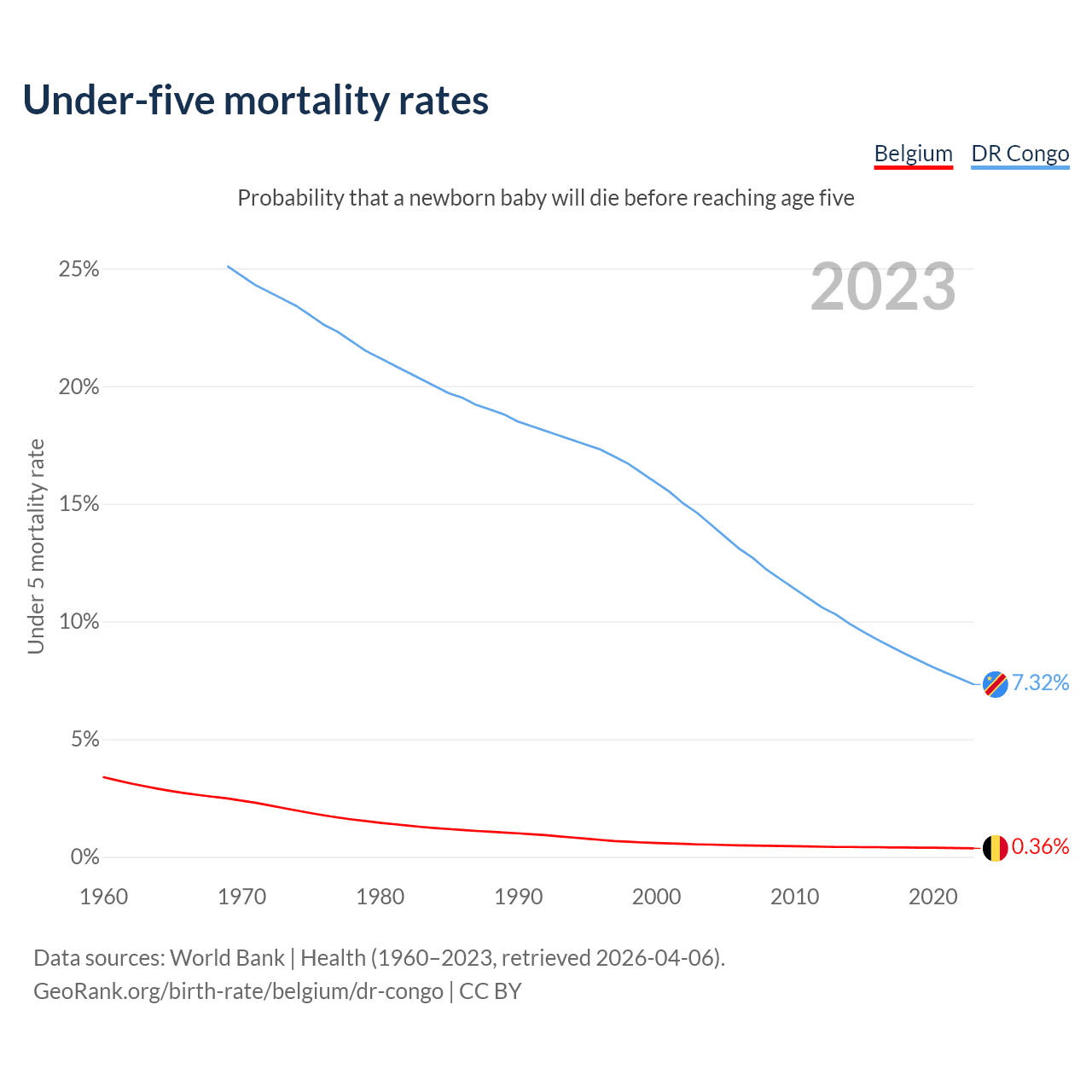 The chance that a newborn baby will die before reaching age five is 0.36% in Belgium and 7.32% in the DR Congo. Above is a chart with historical data on under-five mortality rates.