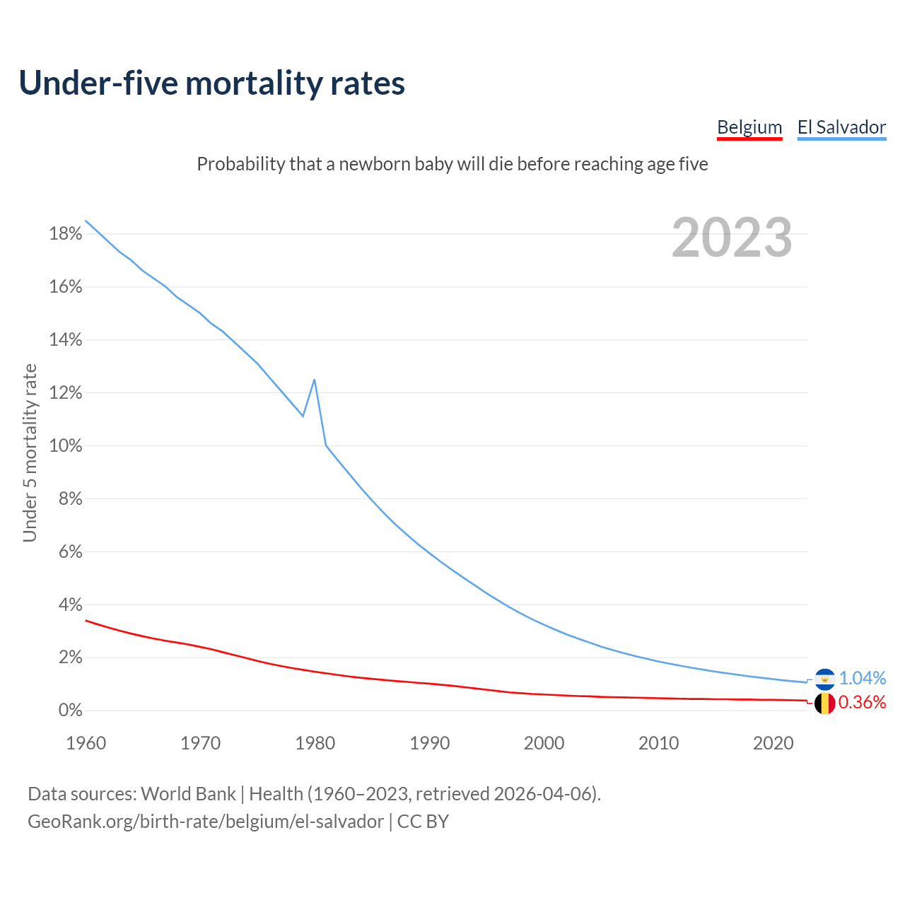 The chance that a newborn baby will die before reaching age five is 0.36% in Belgium and 1.04% in El Salvador. Above is a chart with historical data on under-five mortality rates.
