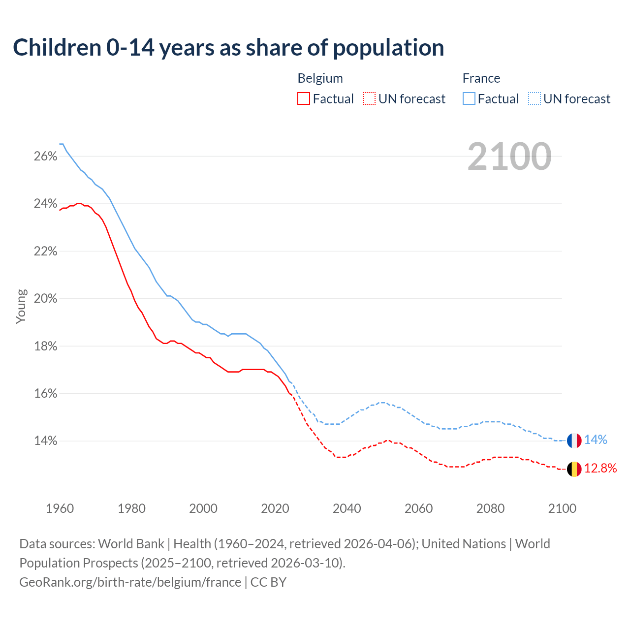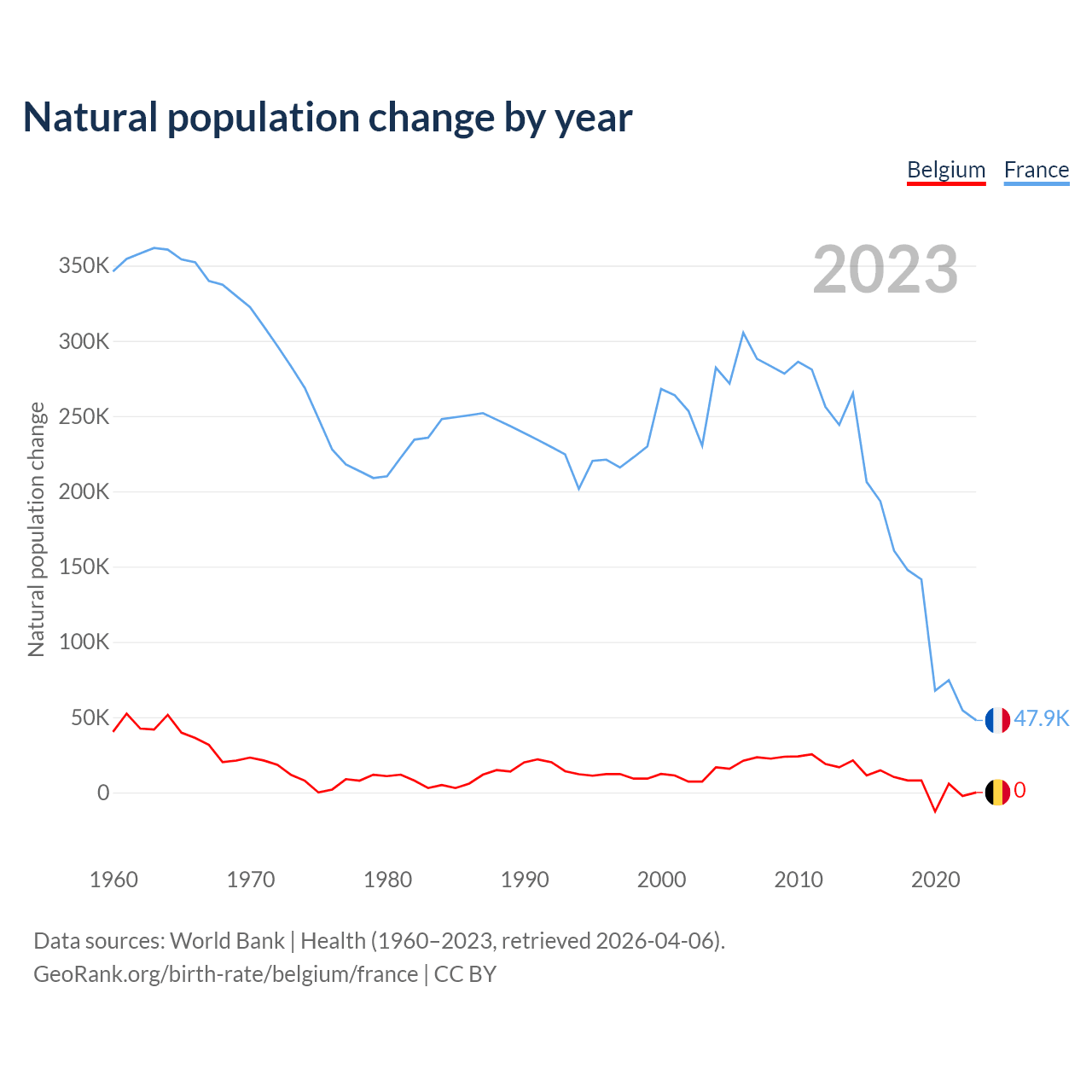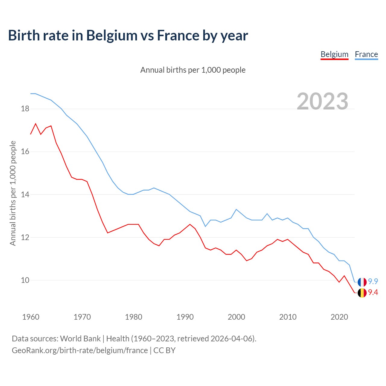 Belgium has an annual birth rate of 9.4 births per 1,000 people, compared to 9.9 for France. The average number of children a woman is expected to have during her lifetime — the fertility rate, is 1.47 in Belgium and 1.66 in France — 12.9% difference.