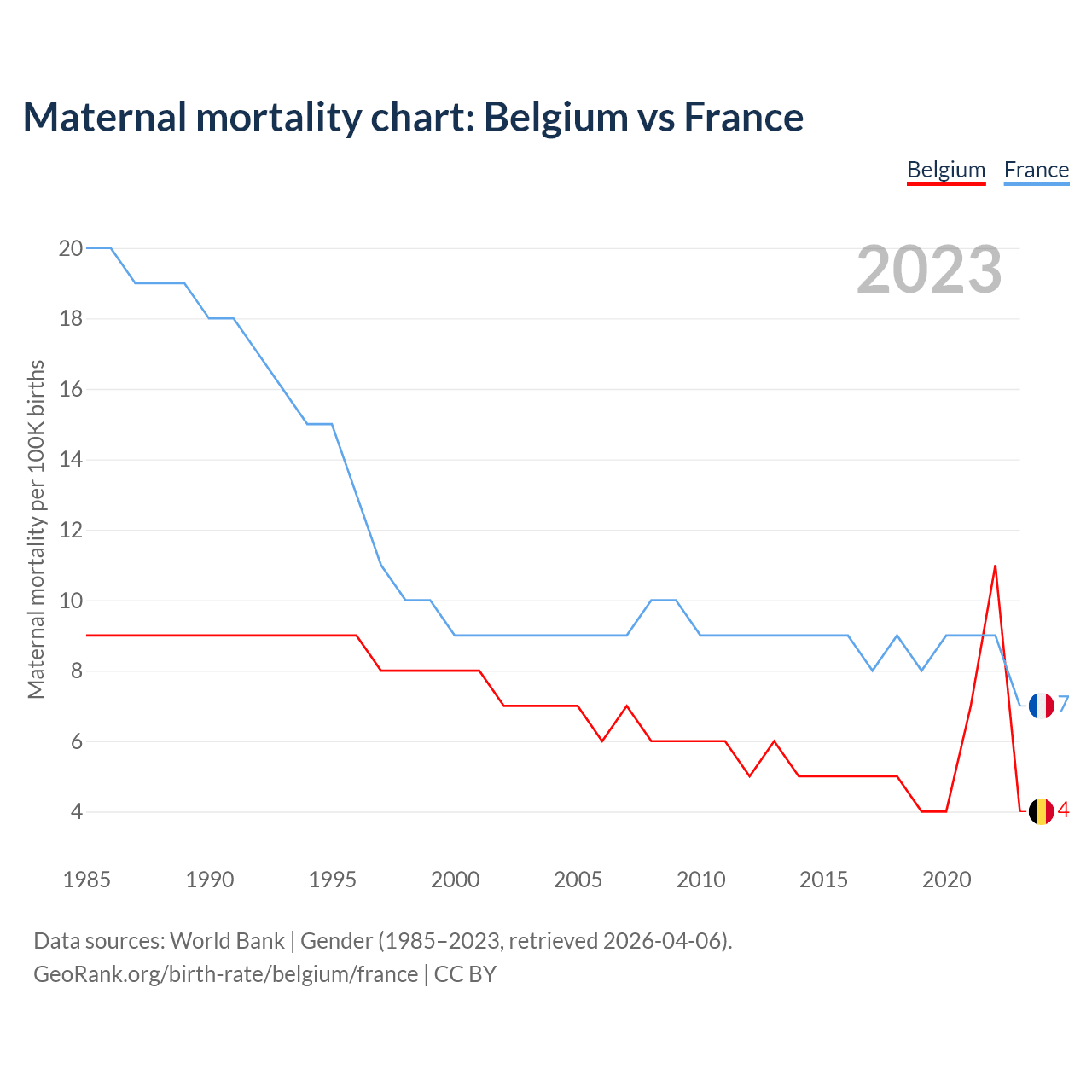 The maternal mortality rate, which is the probability of dying during childbirth or within 42 days of pregnancy termination, is 4 deaths per 100,000 live births in Belgium, compared to 7 deaths in France.