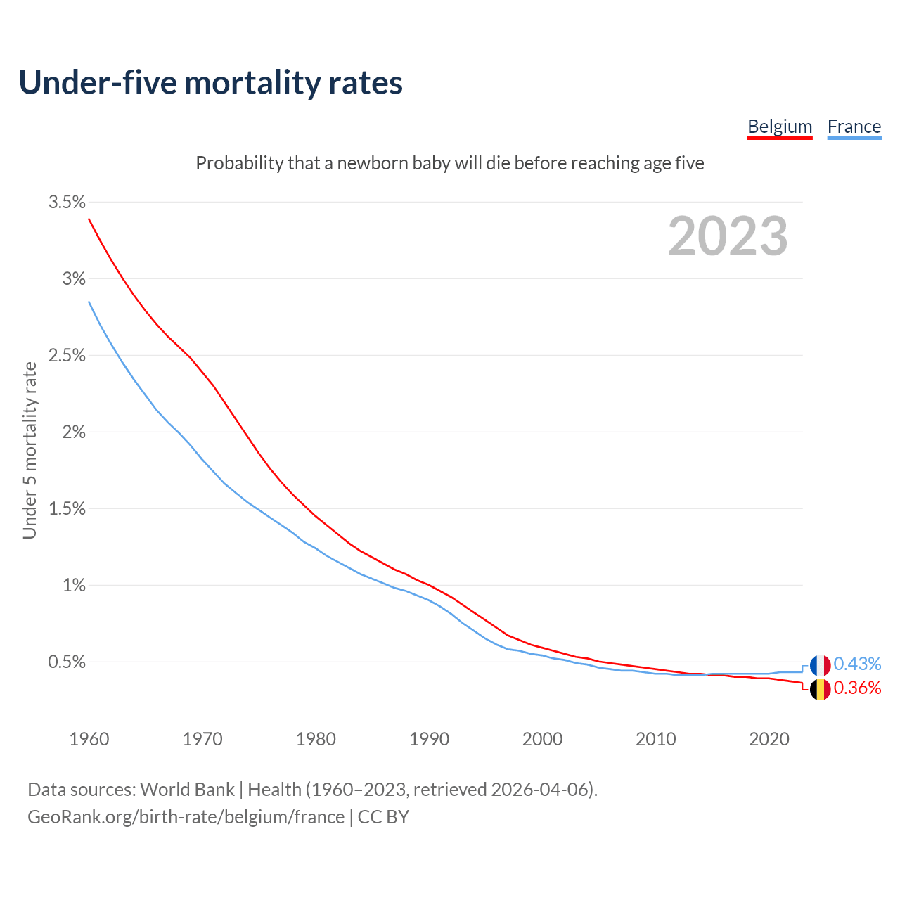 The chance that a newborn baby will die before reaching age five is 0.36% in Belgium and 0.43% in France. Above is a chart with historical data on under-five mortality rates.