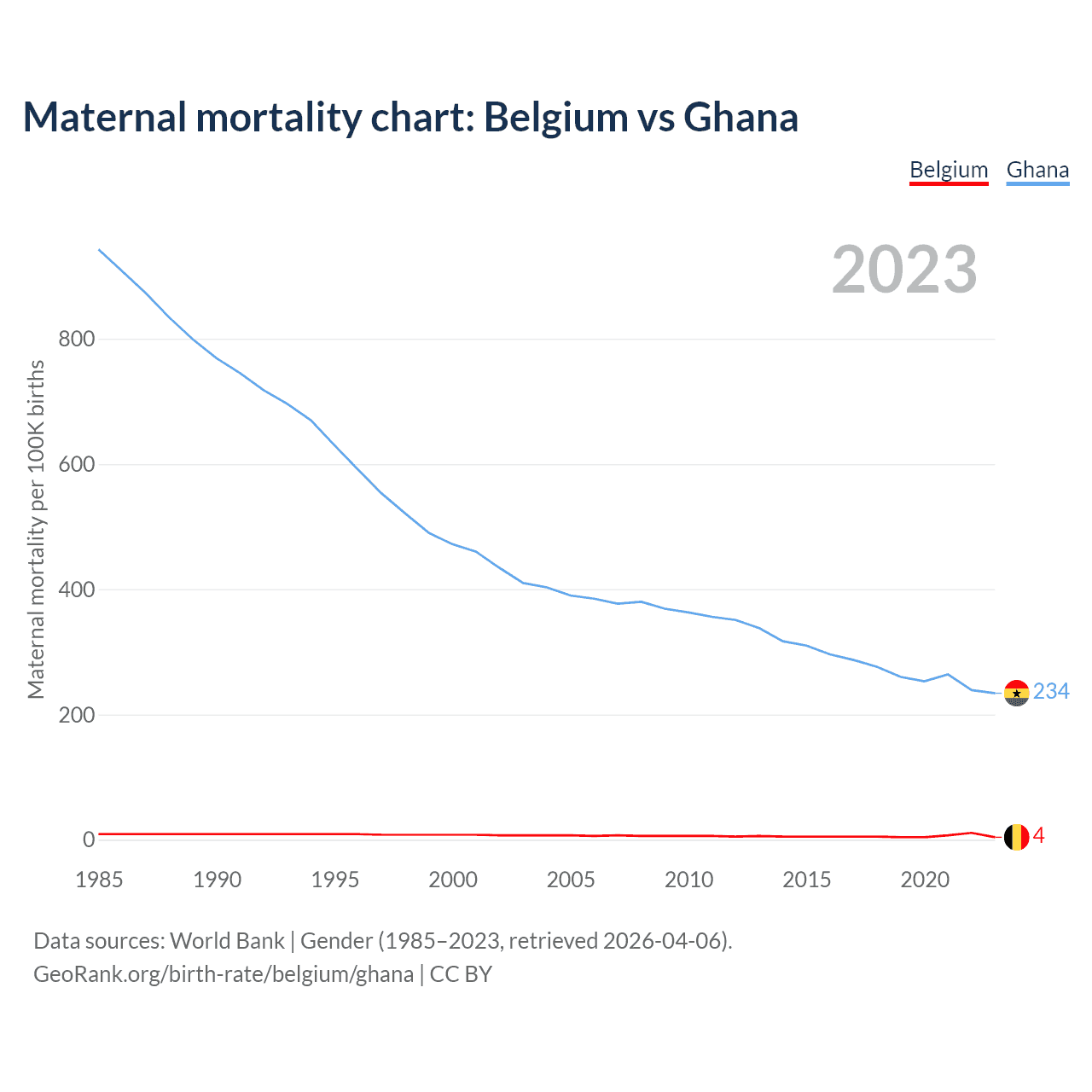 The maternal mortality rate, which is the probability of dying during childbirth or within 42 days of pregnancy termination, is 4 deaths per 100,000 live births in Belgium, compared to 234 deaths in Ghana.