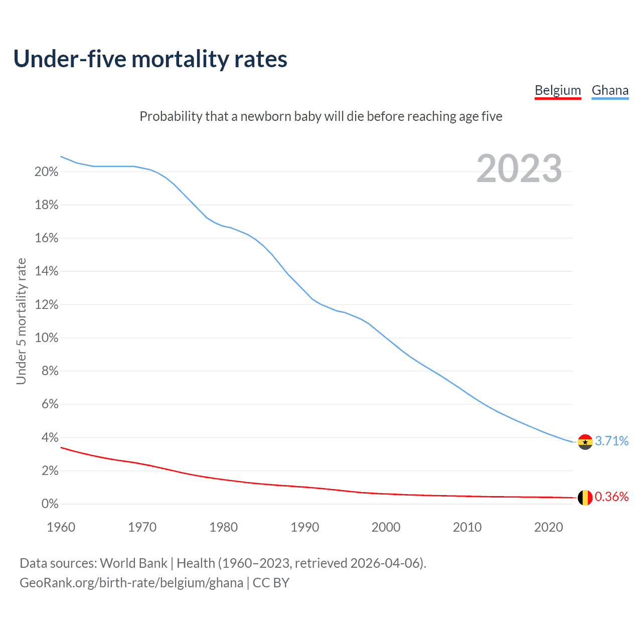 The chance that a newborn baby will die before reaching age five is 0.36% in Belgium and 3.71% in Ghana. Above is a chart with historical data on under-five mortality rates.