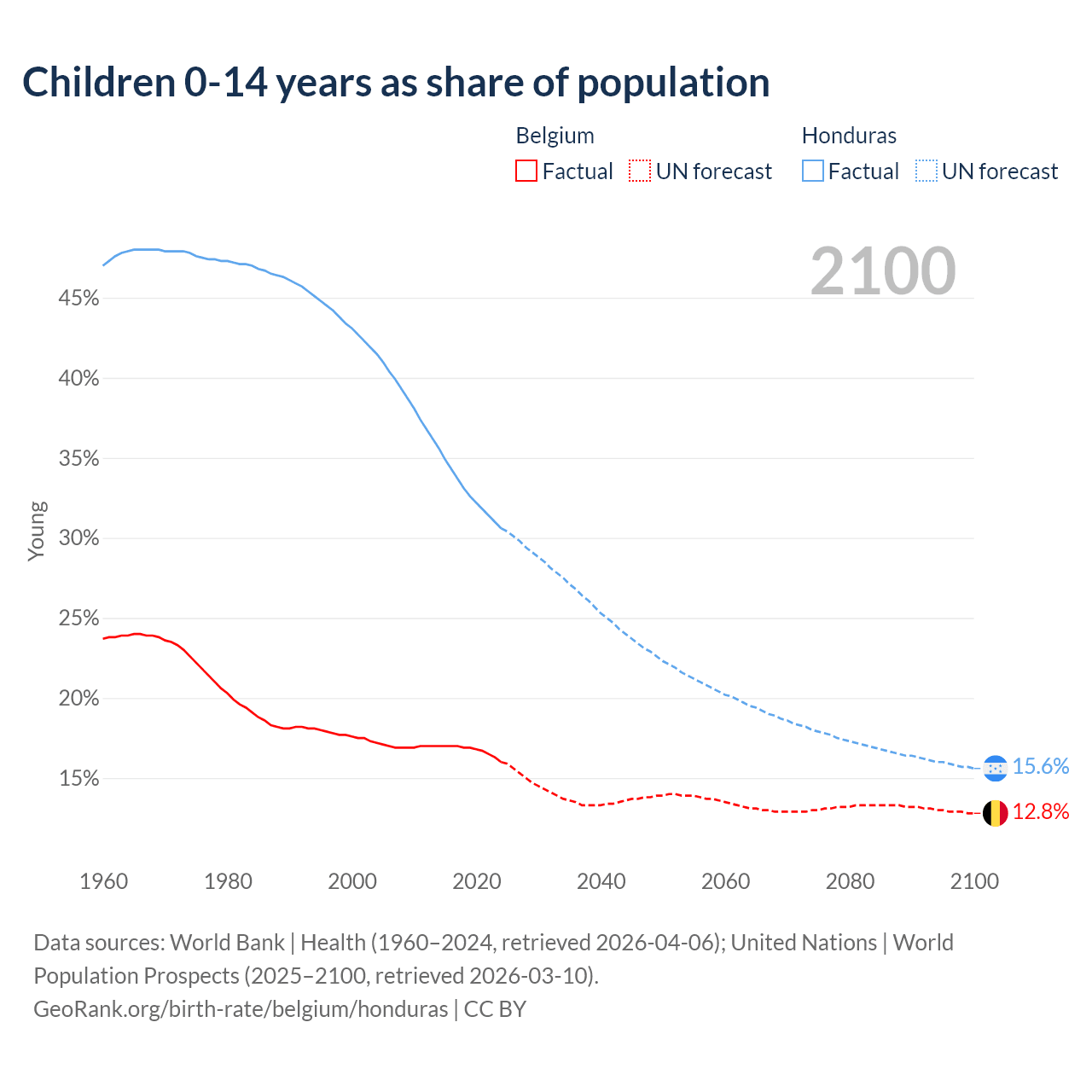 Belgium has an annual birth rate of 9.4 births per 1,000 people, compared to 22 for Honduras. The average number of children a woman is expected to have during her lifetime — the fertility rate, is 1.47 in Belgium and 2.5 in Honduras — 70.1% difference.