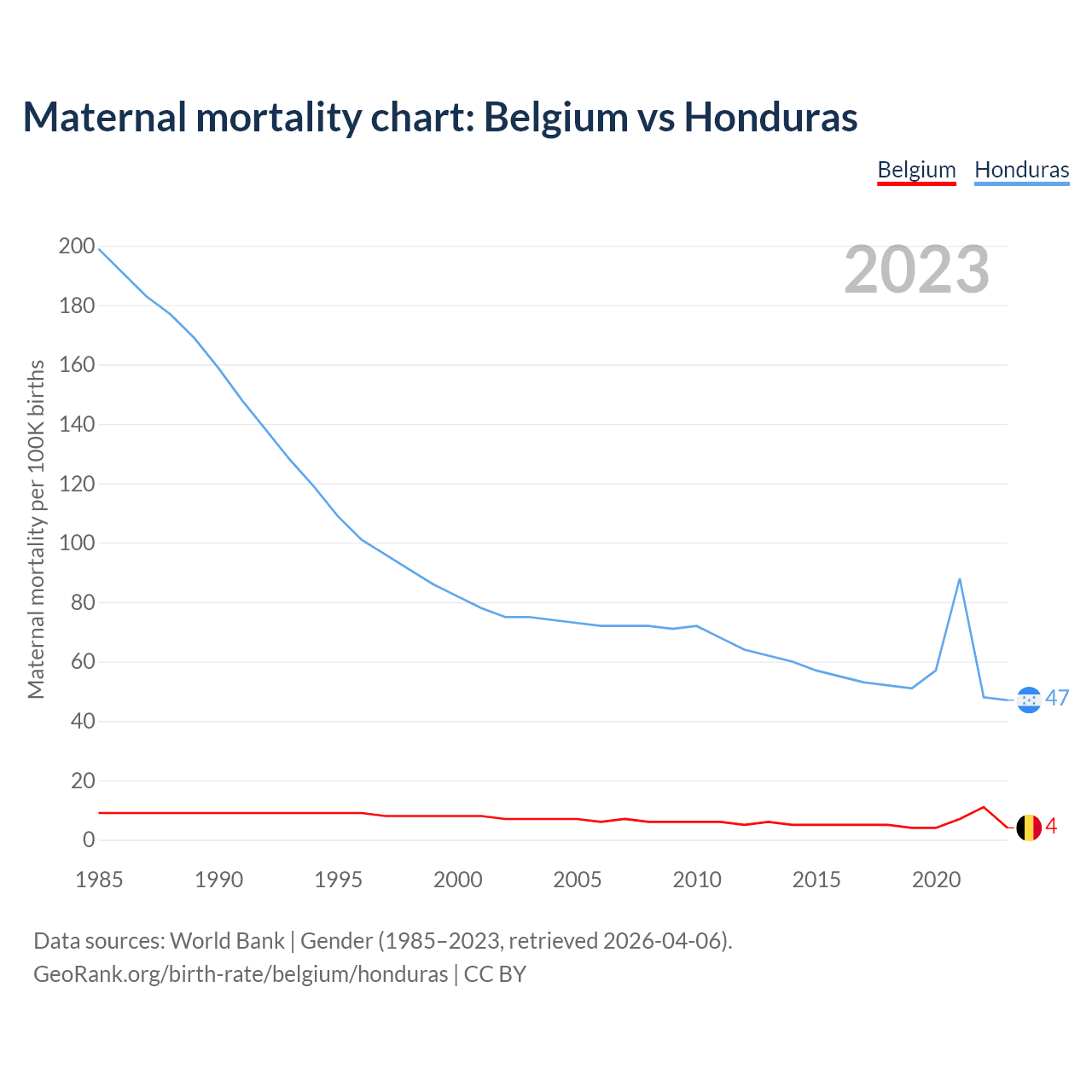 The maternal mortality rate, which is the probability of dying during childbirth or within 42 days of pregnancy termination, is 4 deaths per 100,000 live births in Belgium, compared to 47 deaths in Honduras.