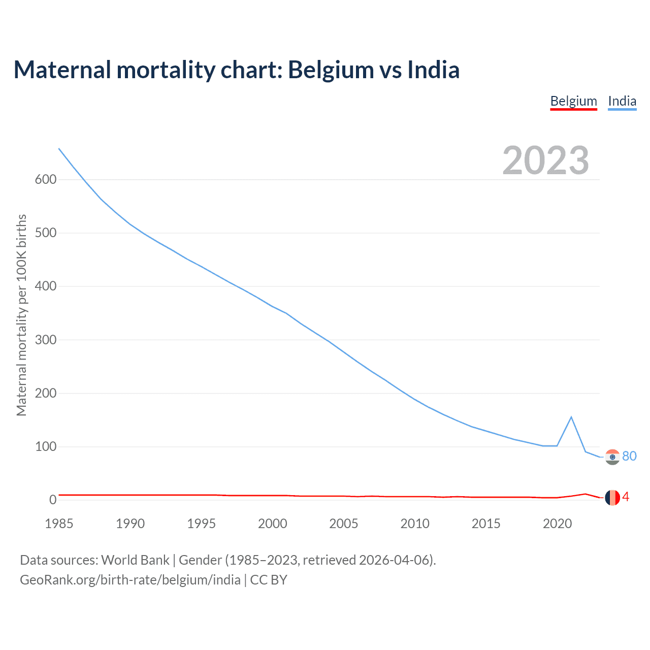 The maternal mortality rate, which is the probability of dying during childbirth or within 42 days of pregnancy termination, is 4 deaths per 100,000 live births in Belgium, compared to 80 deaths in India.