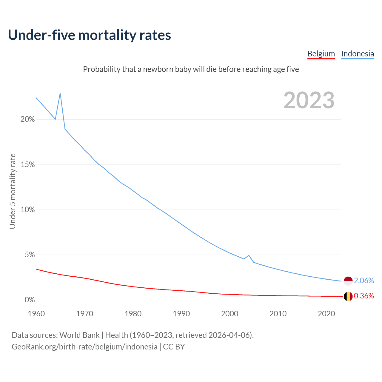 The chance that a newborn baby will die before reaching age five is 0.36% in Belgium and 2.06% in Indonesia. Above is a chart with historical data on under-five mortality rates.