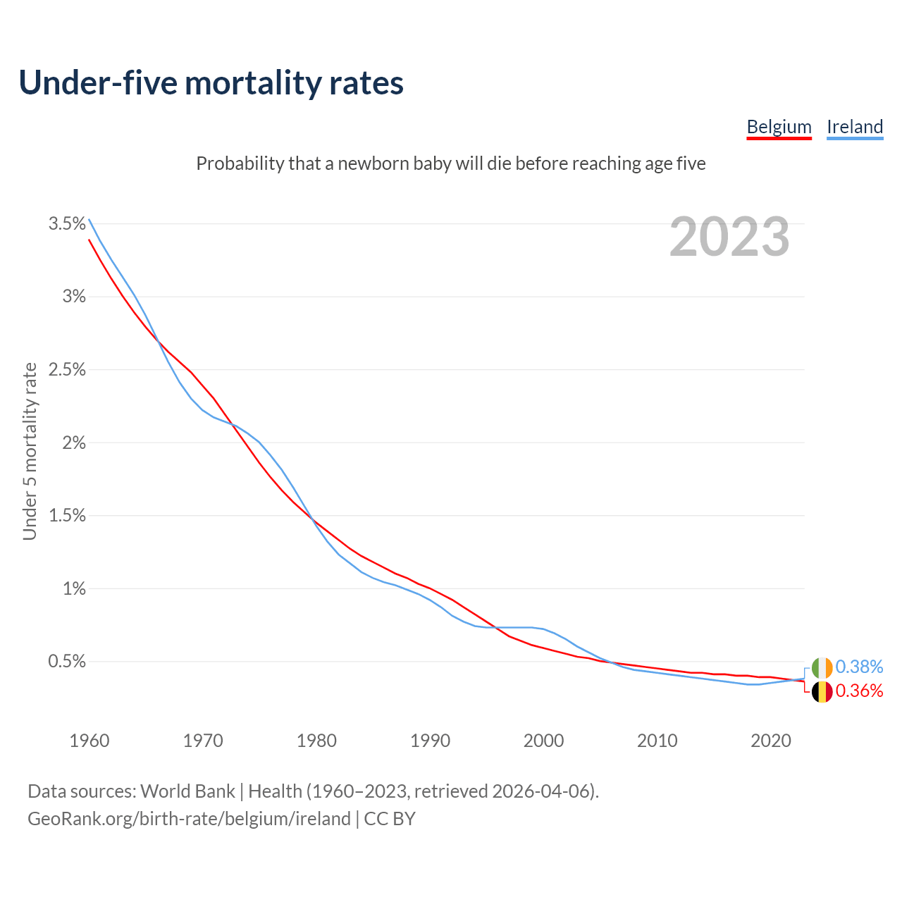 The chance that a newborn baby will die before reaching age five is 0.36% in Belgium and 0.38% in Ireland. Above is a chart with historical data on under-five mortality rates.