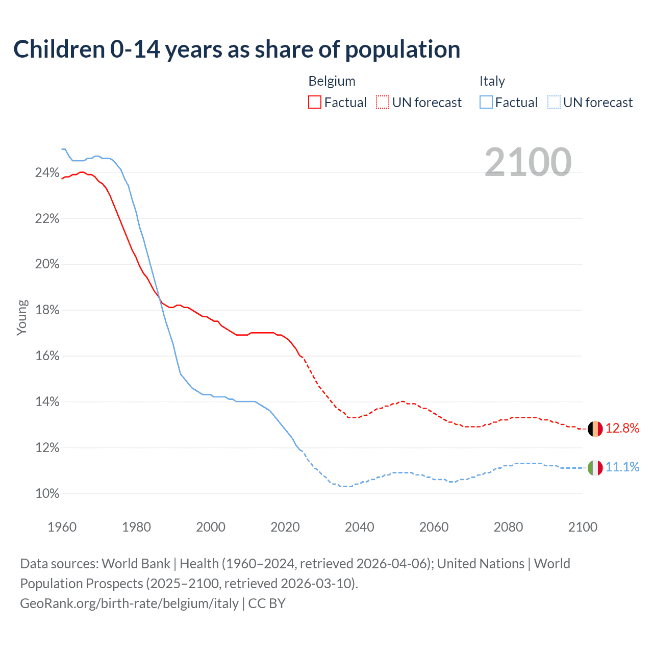 According to the latest available data on birth rates, the fertility rate in Belgium was 1.47 children per woman in 2023, compared to 1.2 in Italy in 2023. The replacement level is considered to be 2.1 children per woman.