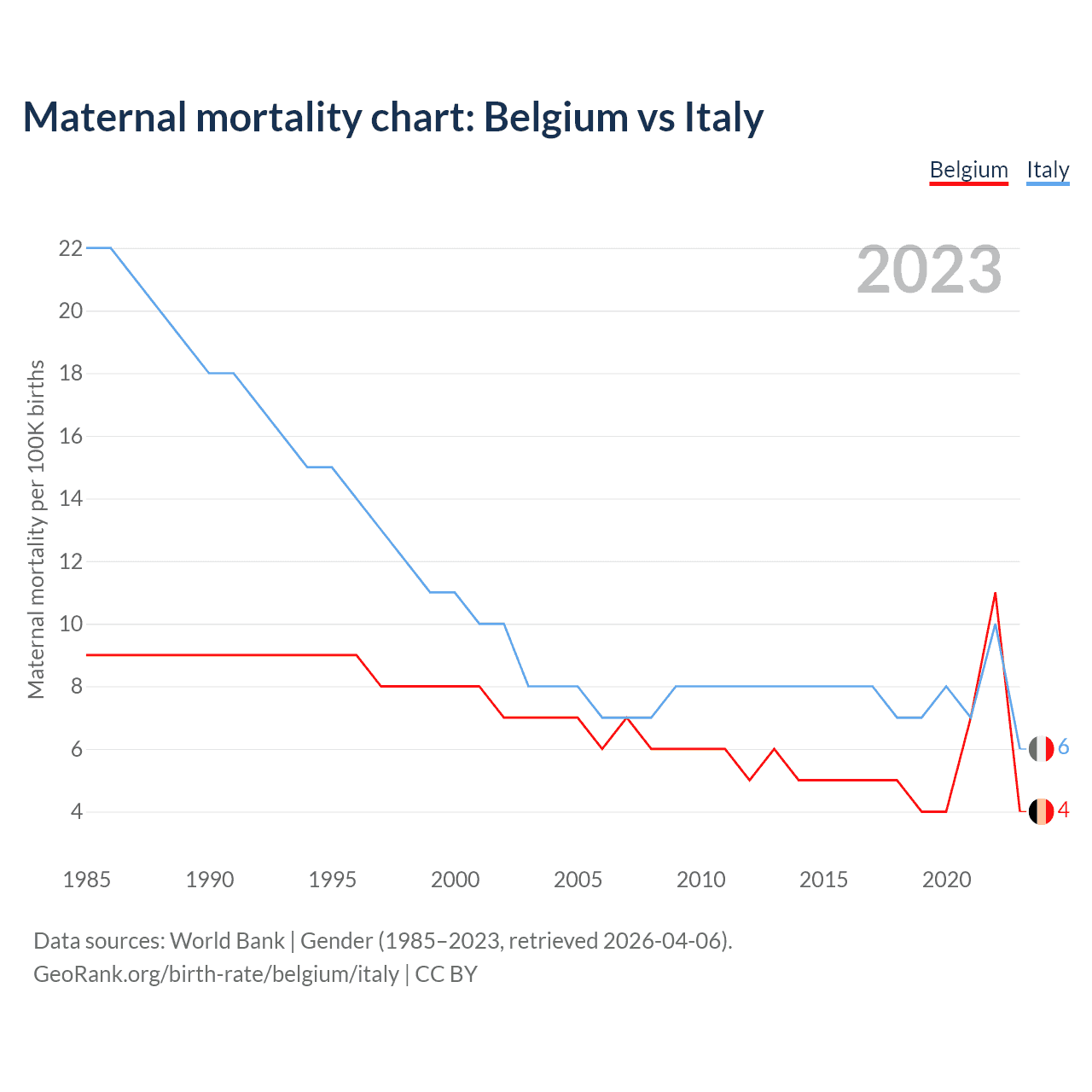 The maternal mortality rate, which is the probability of dying during childbirth or within 42 days of pregnancy termination, is 4 deaths per 100,000 live births in Belgium, compared to 6 deaths in Italy.