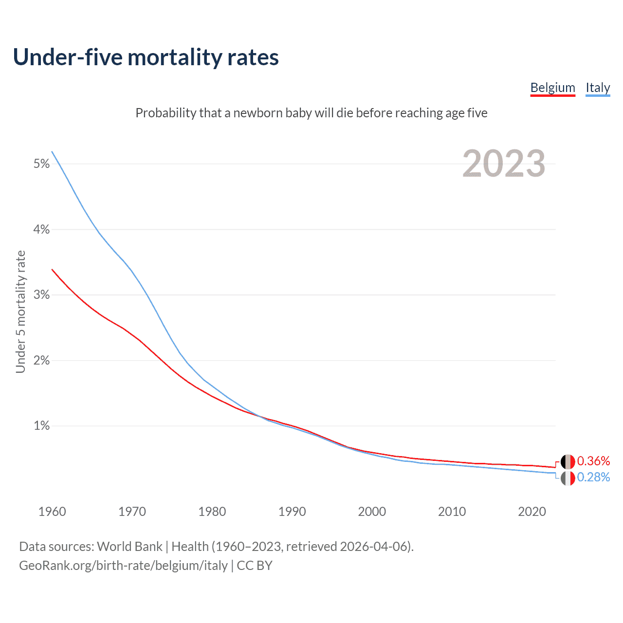 The chance that a newborn baby will die before reaching age five is 0.36% in Belgium and 0.28% in Italy. Above is a chart with historical data on under-five mortality rates.