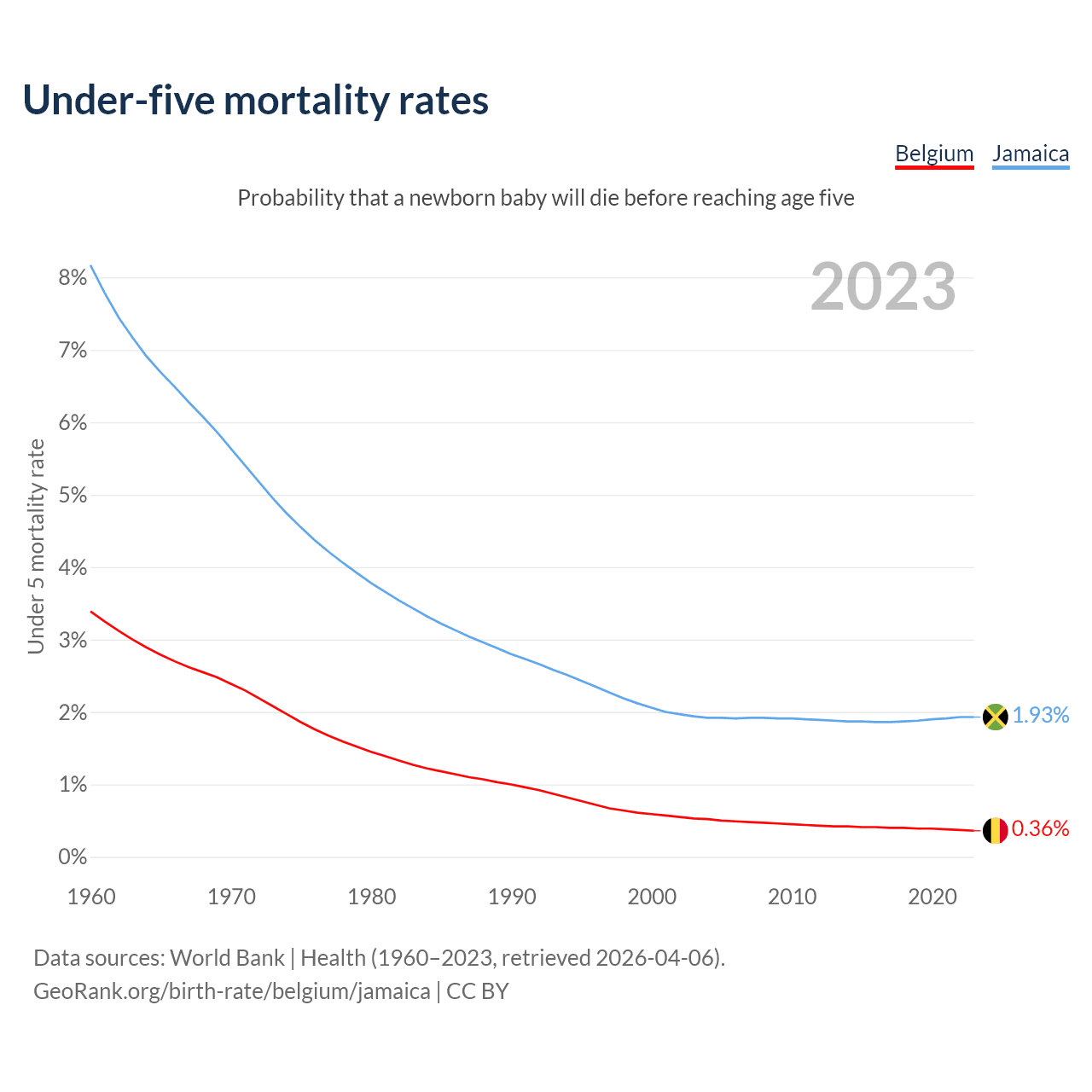The chance that a newborn baby will die before reaching age five is 0.36% in Belgium and 1.93% in Jamaica. Above is a chart with historical data on under-five mortality rates.