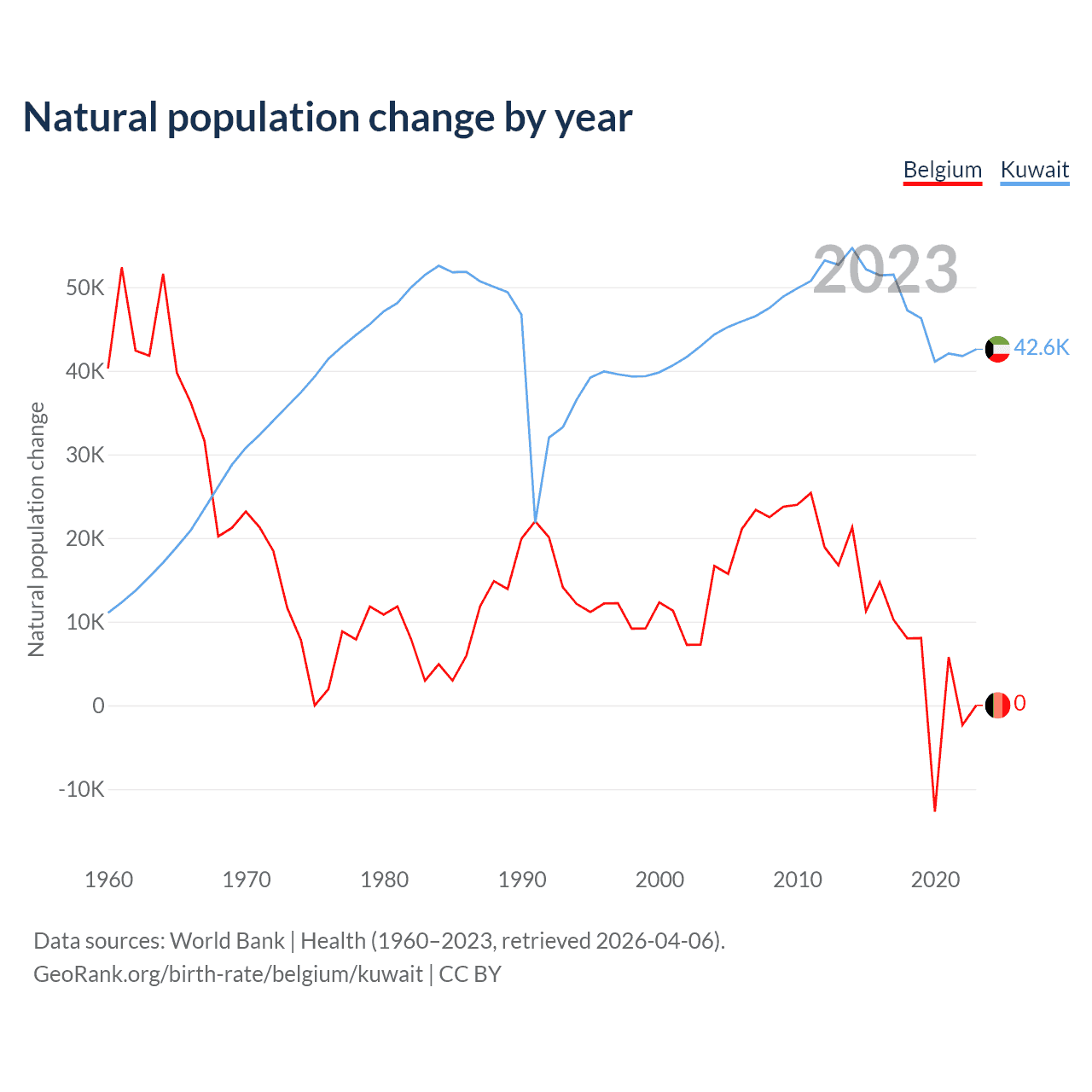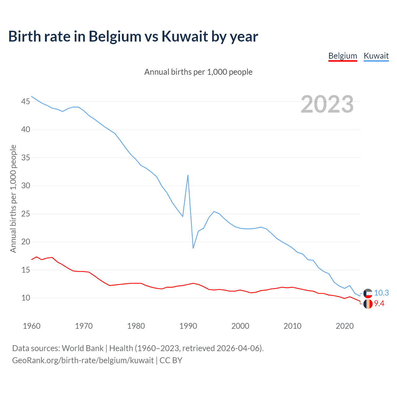 Belgium has an annual birth rate of 9.4 births per 1,000 people, compared to 10.3 for Kuwait. The average number of children a woman is expected to have during her lifetime — the fertility rate, is 1.47 in Belgium and 1.52 in Kuwait — 3.67% difference.