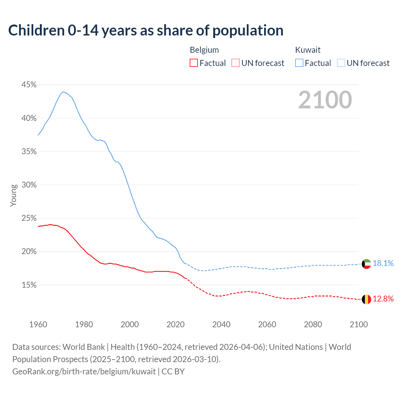 According to the latest available data on birth rates, the fertility rate in Belgium was 1.47 children per woman in 2023, compared to 1.52 in Kuwait in 2023. The replacement level is considered to be 2.1 children per woman.
