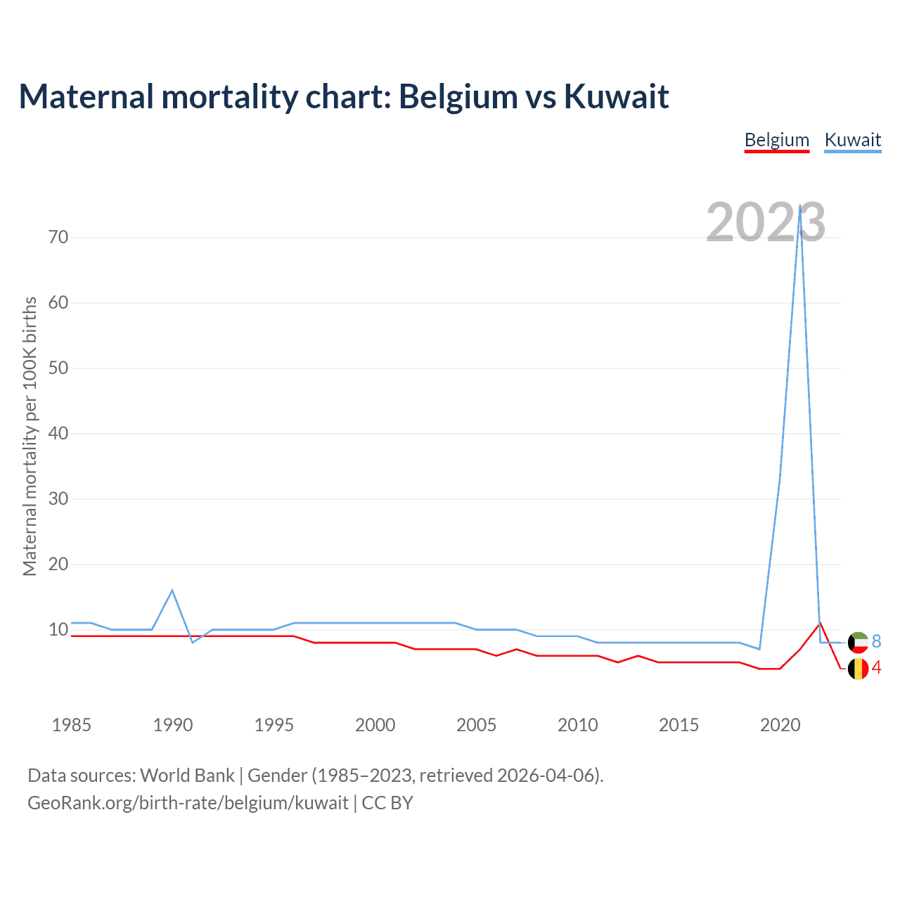 The maternal mortality rate, which is the probability of dying during childbirth or within 42 days of pregnancy termination, is 4 deaths per 100,000 live births in Belgium, compared to 8 deaths in Kuwait.