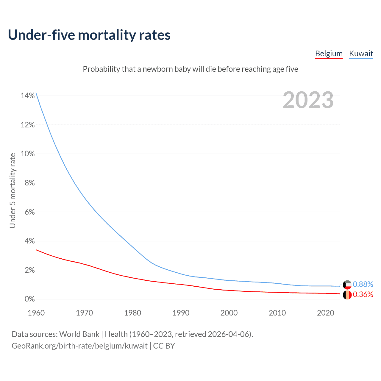 The chance that a newborn baby will die before reaching age five is 0.36% in Belgium and 0.88% in Kuwait. Above is a chart with historical data on under-five mortality rates.