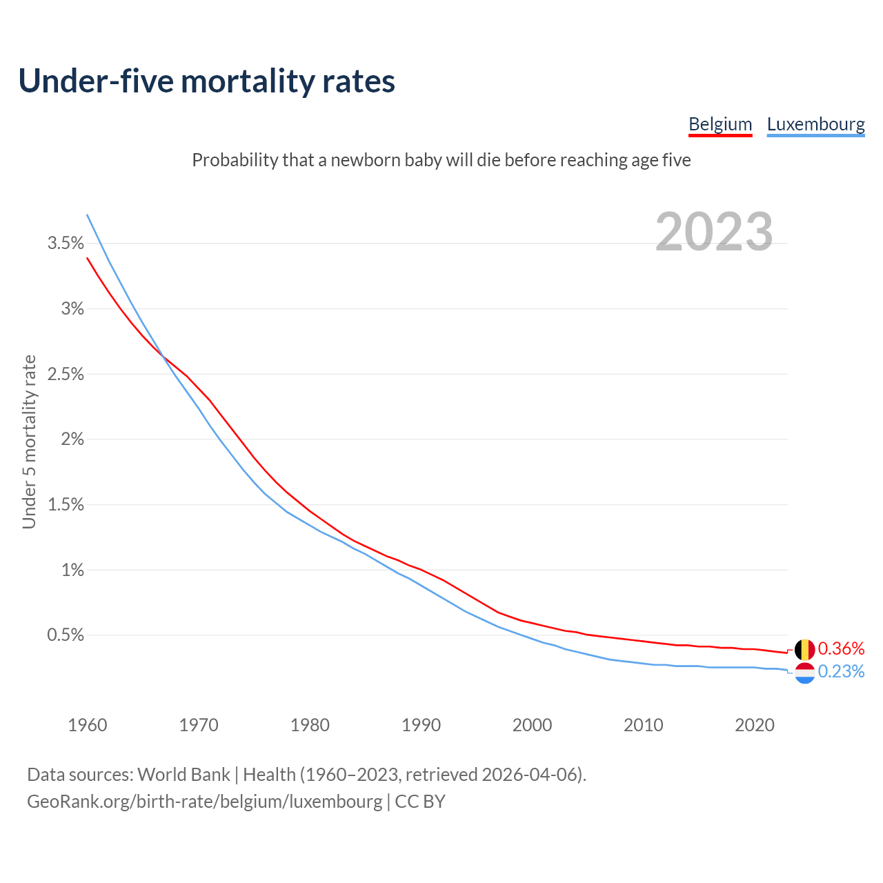 The chance that a newborn baby will die before reaching age five is 0.36% in Belgium and 0.23% in Luxembourg. Above is a chart with historical data on under-five mortality rates.
