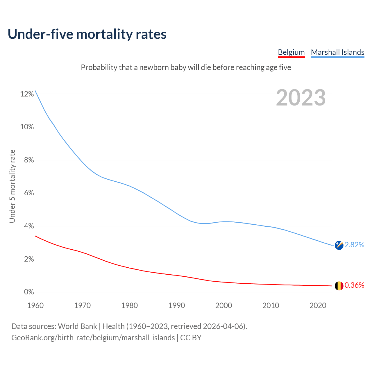 The chance that a newborn baby will die before reaching age five is 0.36% in Belgium and 2.82% in the Marshall Islands. Above is a chart with historical data on under-five mortality rates.