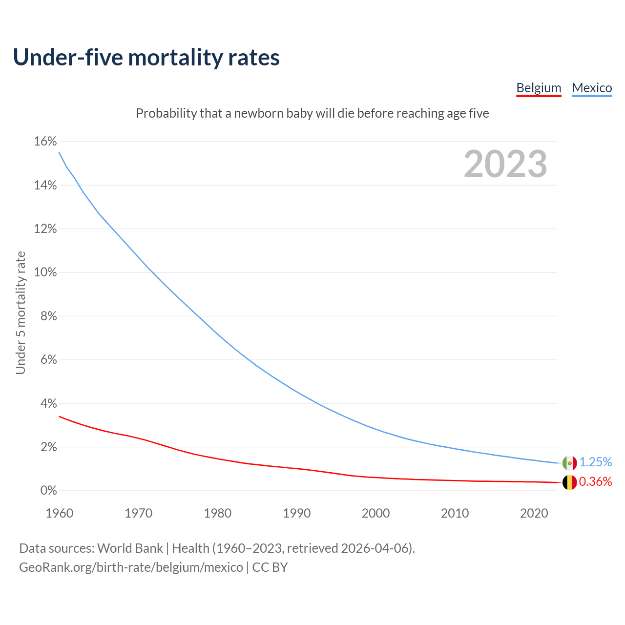 The chance that a newborn baby will die before reaching age five is 0.36% in Belgium and 1.25% in Mexico. Above is a chart with historical data on under-five mortality rates.
