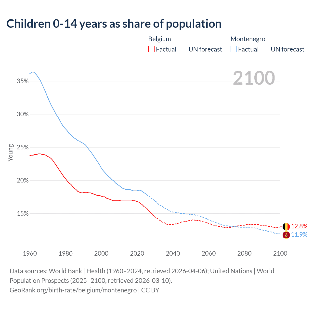 Belgium has an annual birth rate of 9.4 births per 1,000 people, compared to 11.2 for Montenegro. The average number of children a woman is expected to have during her lifetime — the fertility rate, is 1.47 in Belgium and 1.74 in Montenegro — 18.4% difference.