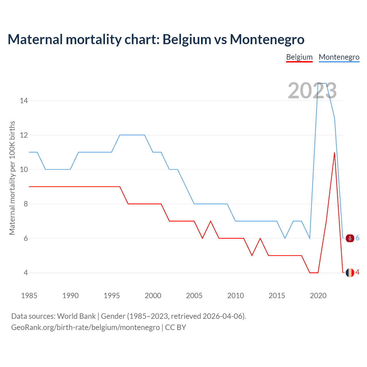The maternal mortality rate, which is the probability of dying during childbirth or within 42 days of pregnancy termination, is 4 deaths per 100,000 live births in Belgium, compared to 6 deaths in Montenegro.