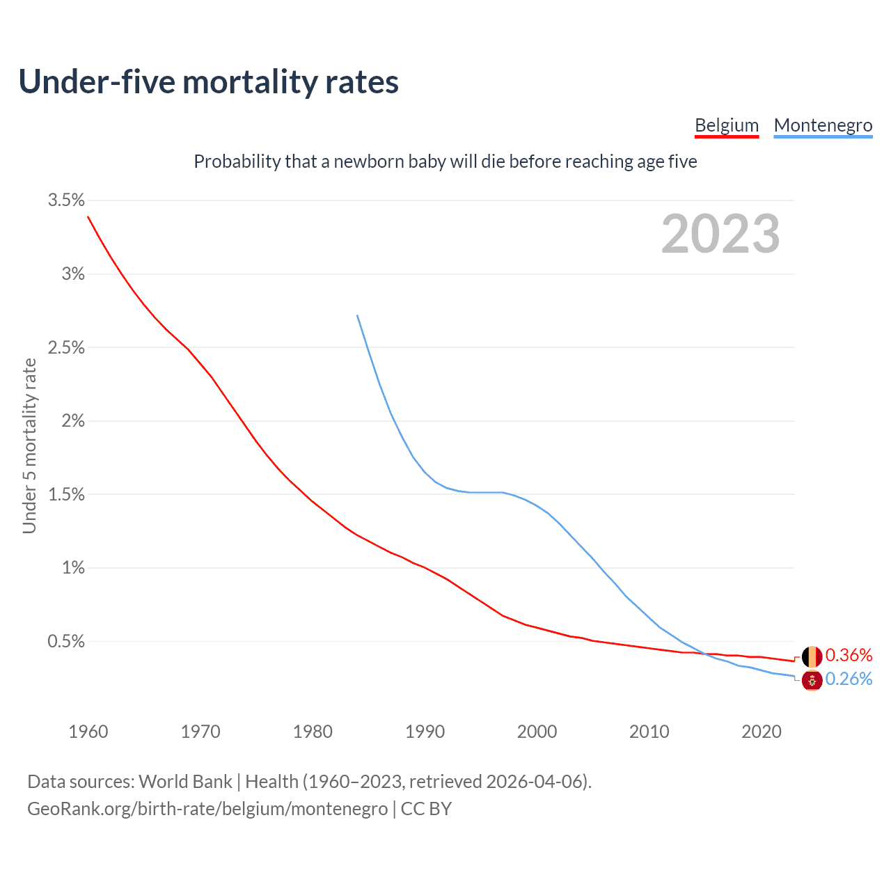 The chance that a newborn baby will die before reaching age five is 0.36% in Belgium and 0.26% in Montenegro. Above is a chart with historical data on under-five mortality rates.