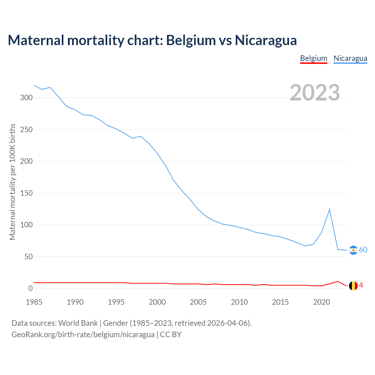 The maternal mortality rate, which is the probability of dying during childbirth or within 42 days of pregnancy termination, is 4 deaths per 100,000 live births in Belgium, compared to 60 deaths in Nicaragua.