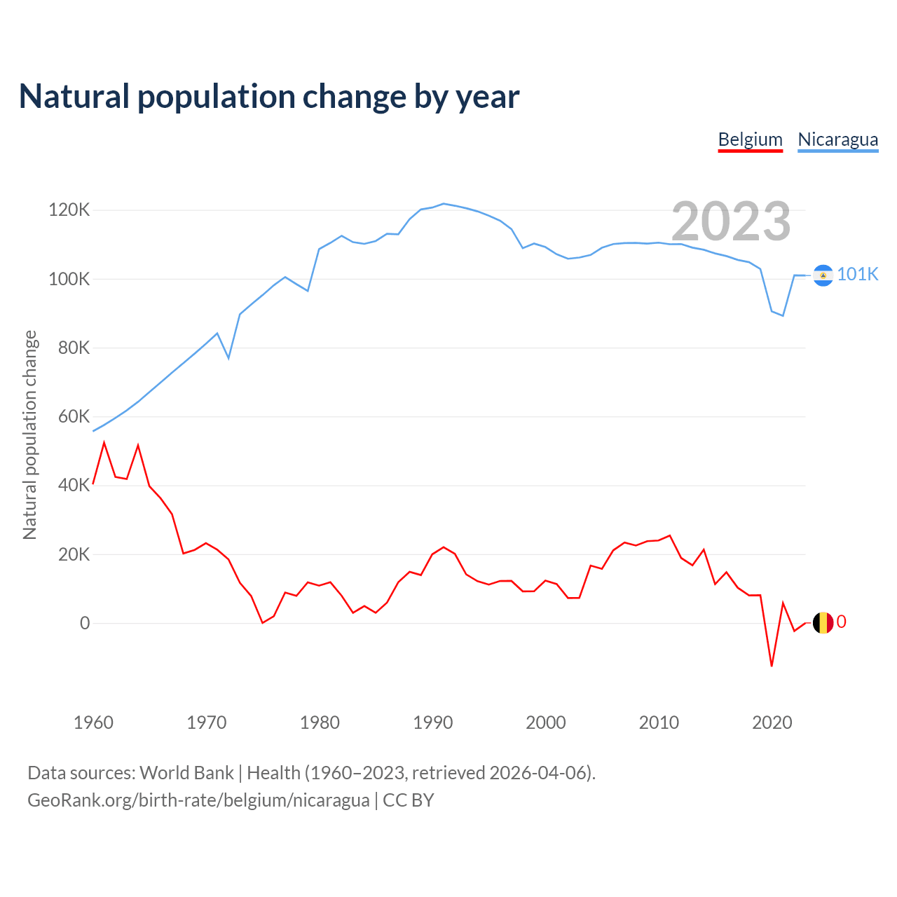 According to the latest available data on birth rates, the fertility rate in Belgium was 1.47 children per woman in 2023, compared to 2.22 in Nicaragua in 2023. The replacement level is considered to be 2.1 children per woman.