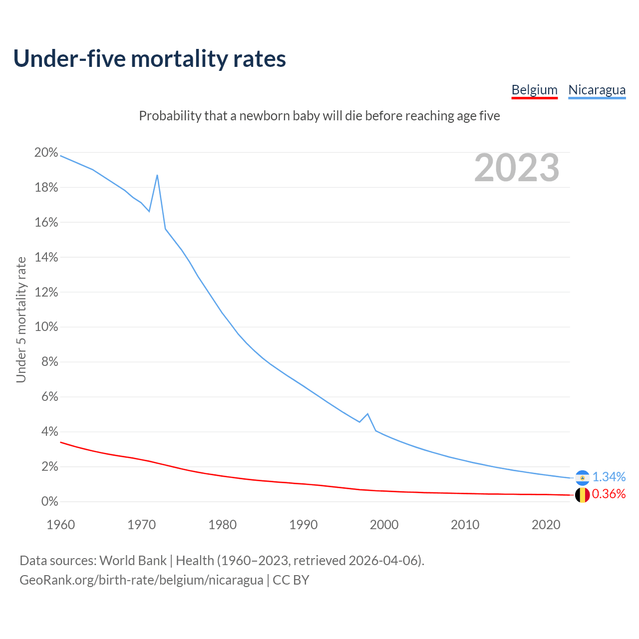 The chance that a newborn baby will die before reaching age five is 0.36% in Belgium and 1.34% in Nicaragua. Above is a chart with historical data on under-five mortality rates.