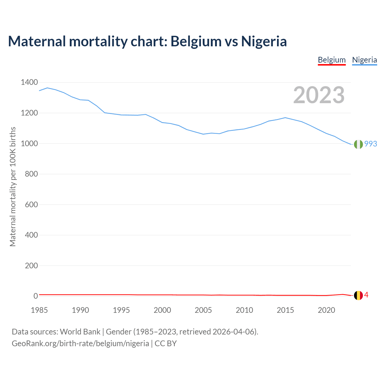 The maternal mortality rate, which is the probability of dying during childbirth or within 42 days of pregnancy termination, is 4 deaths per 100,000 live births in Belgium, compared to 993 deaths in Nigeria.
