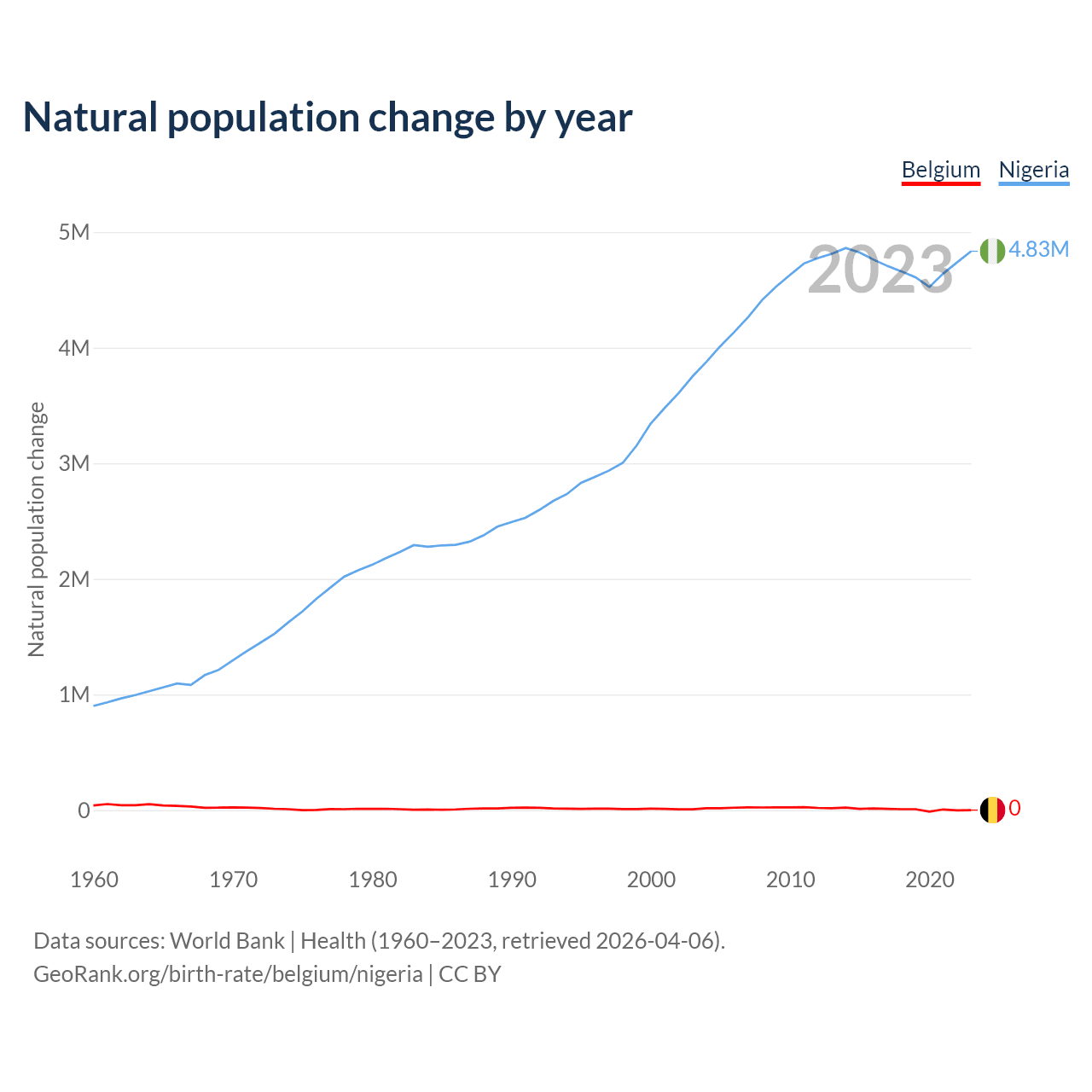Belgium has an annual birth rate of 9.4 births per 1,000 people, compared to 33 for Nigeria. The average number of children a woman is expected to have during her lifetime — the fertility rate, is 1.47 in Belgium and 4.48 in Nigeria — 204.9% difference.