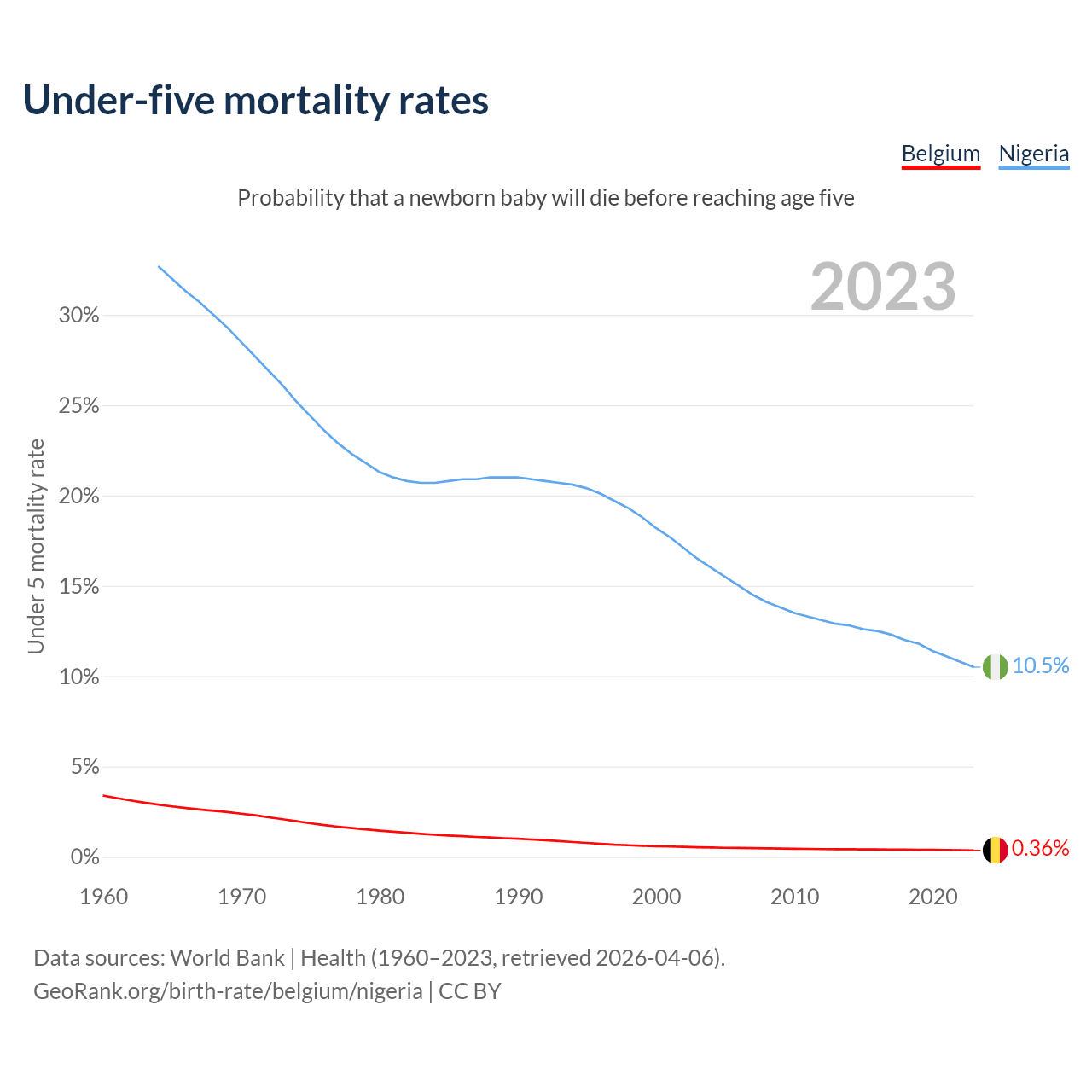 The chance that a newborn baby will die before reaching age five is 0.36% in Belgium and 10.5% in Nigeria. Above is a chart with historical data on under-five mortality rates.