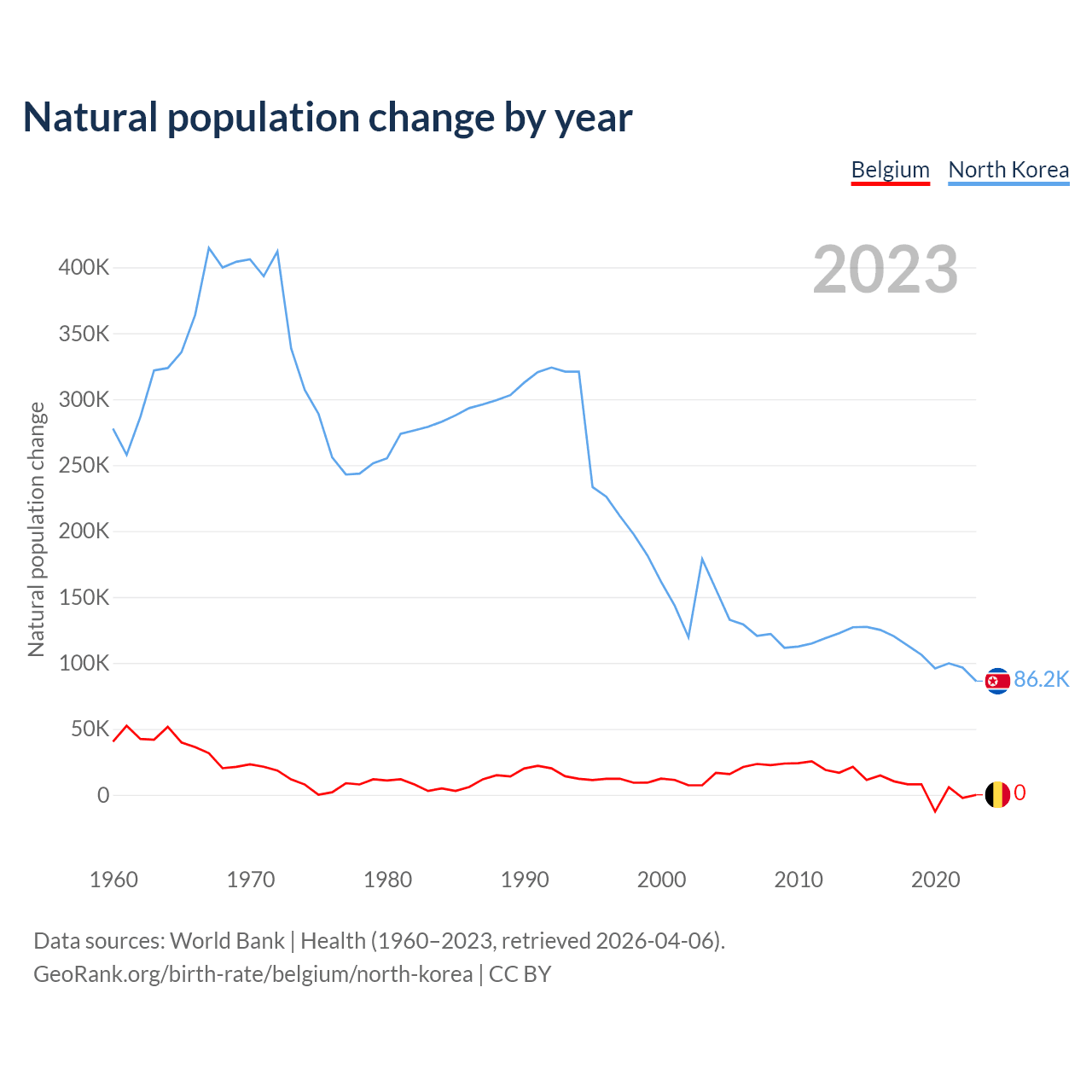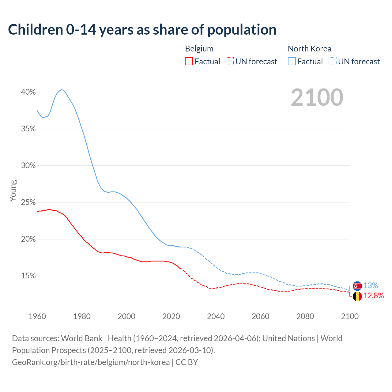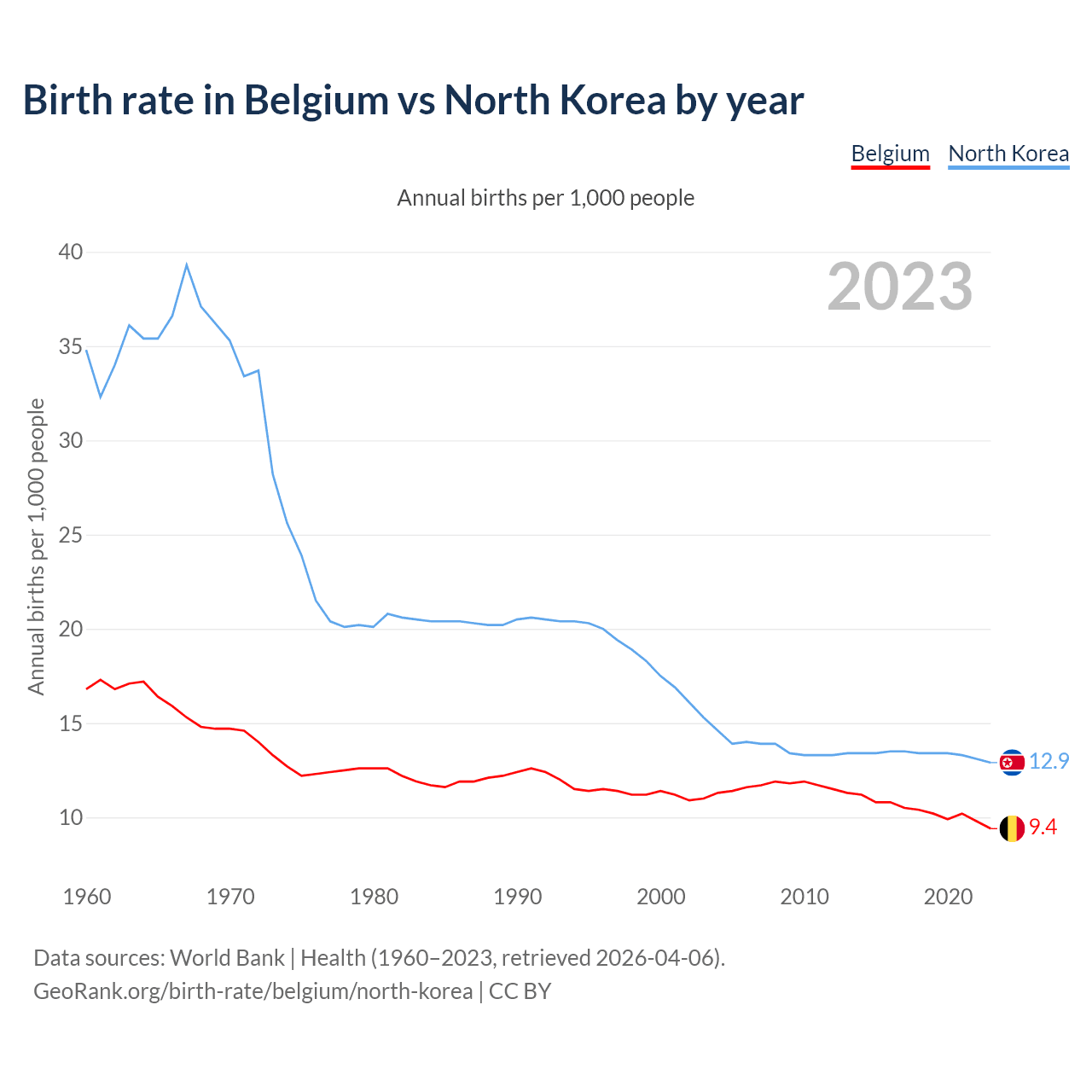 Belgium has an annual birth rate of 9.4 births per 1,000 people, compared to 12.9 for North Korea. The average number of children a woman is expected to have during her lifetime — the fertility rate, is 1.47 in Belgium and 1.78 in North Korea — 21.1% difference.