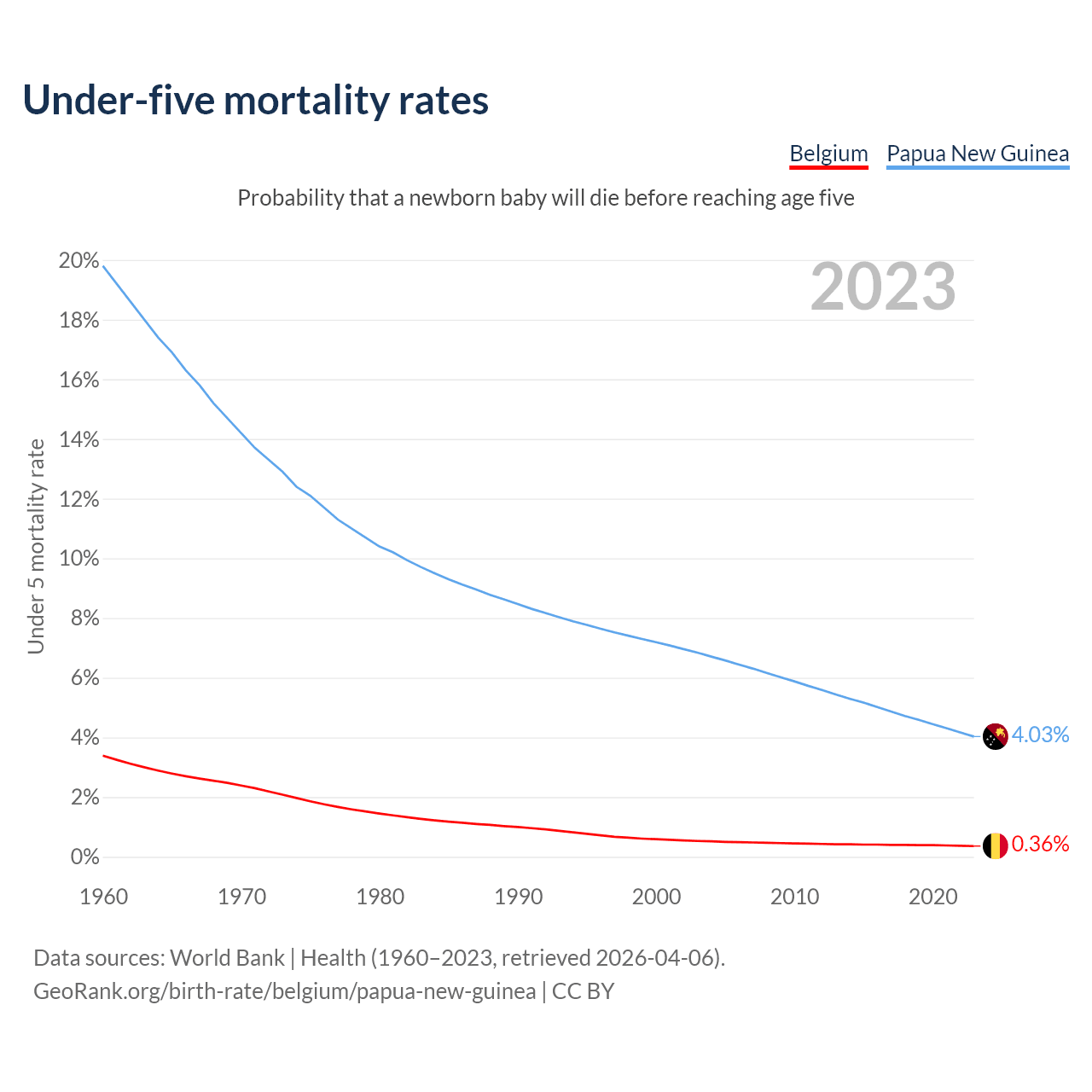 The chance that a newborn baby will die before reaching age five is 0.36% in Belgium and 4.03% in Papua New Guinea. Above is a chart with historical data on under-five mortality rates.