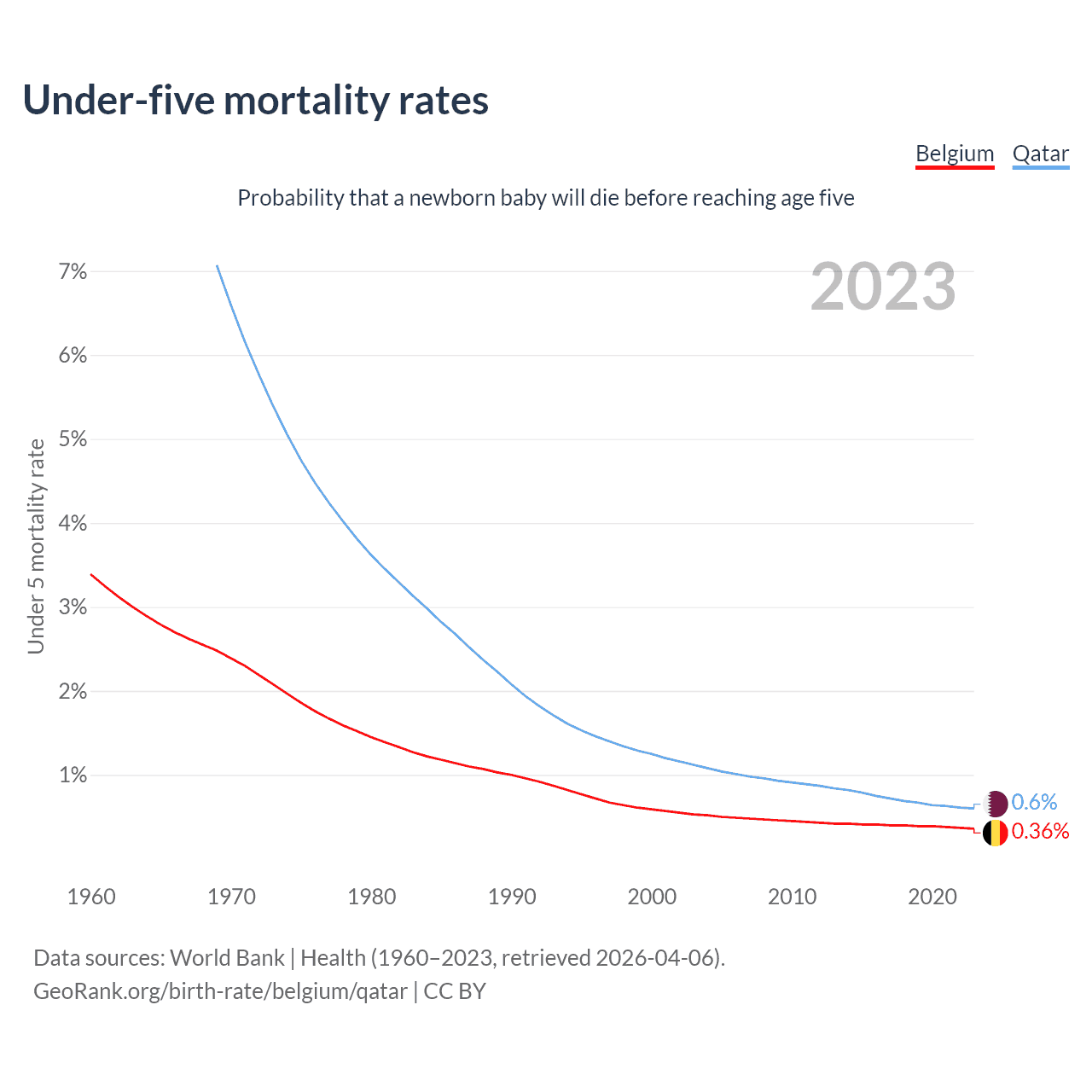 The chance that a newborn baby will die before reaching age five is 0.36% in Belgium and 0.6% in Qatar. Above is a chart with historical data on under-five mortality rates.