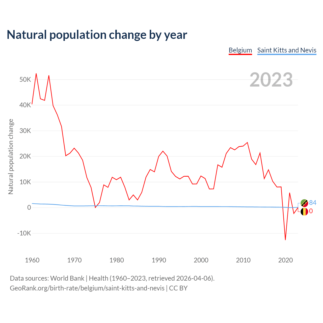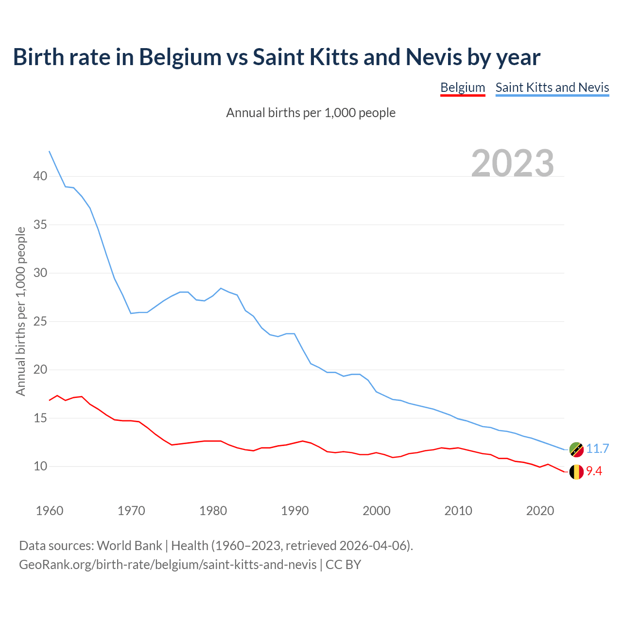 Belgium has an annual birth rate of 9.4 births per 1,000 people, compared to 11.7 for Saint Kitts and Nevis. The average number of children a woman is expected to have during her lifetime — the fertility rate, is 1.47 in Belgium and 1.51 in Saint Kitts and Nevis — 2.38% difference.
