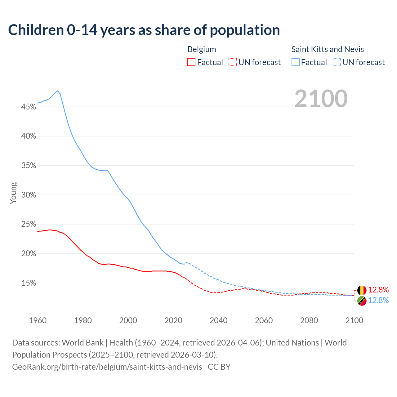 According to the latest available data on birth rates, the fertility rate in Belgium was 1.47 children per woman in 2023, compared to 1.51 in Saint Kitts and Nevis in 2023. The replacement level is considered to be 2.1 children per woman.