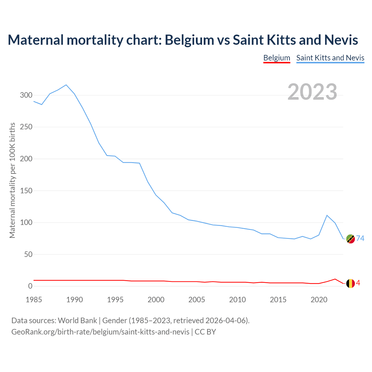 The maternal mortality rate, which is the probability of dying during childbirth or within 42 days of pregnancy termination, is 4 deaths per 100,000 live births in Belgium, compared to 74 deaths in Saint Kitts and Nevis.